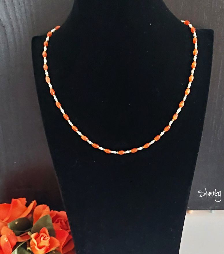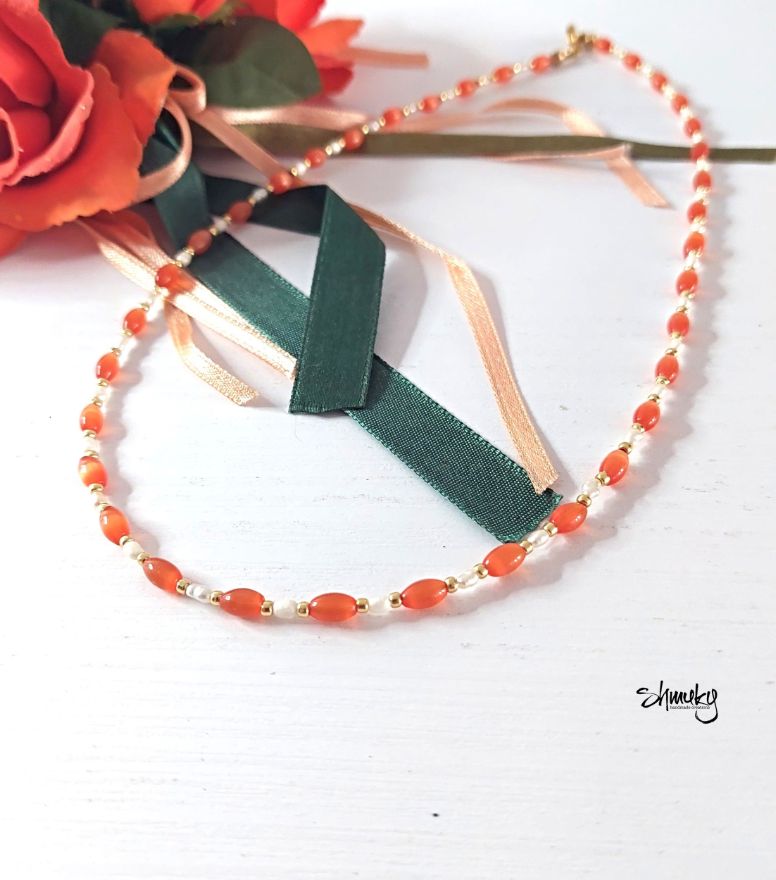 Náhrdelník v barevné kombinaci oranžová, bílá a zlatá je vyrobený z korálků typu cat´s eye, drobných kultivovaných perliček a pozlacených rokajlových korálků, které jsem navlekla na bižuterní lanko.