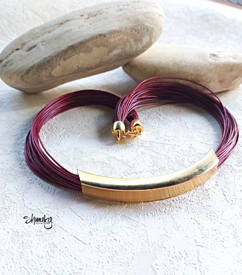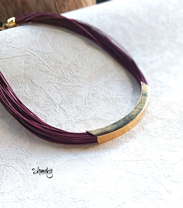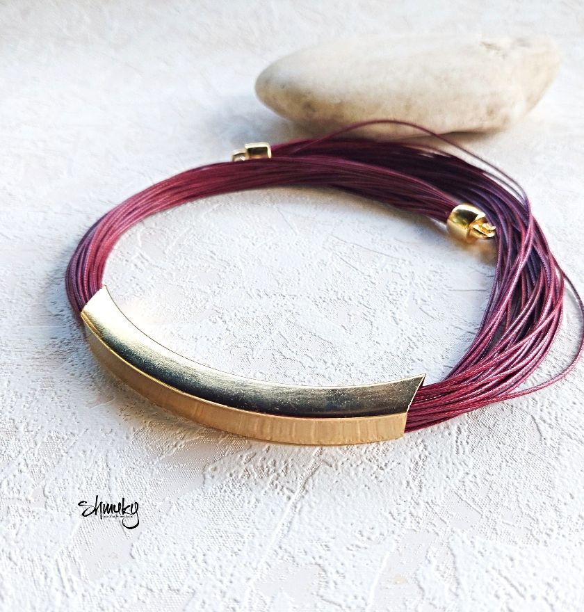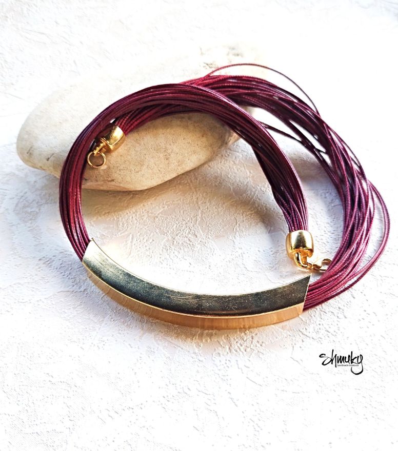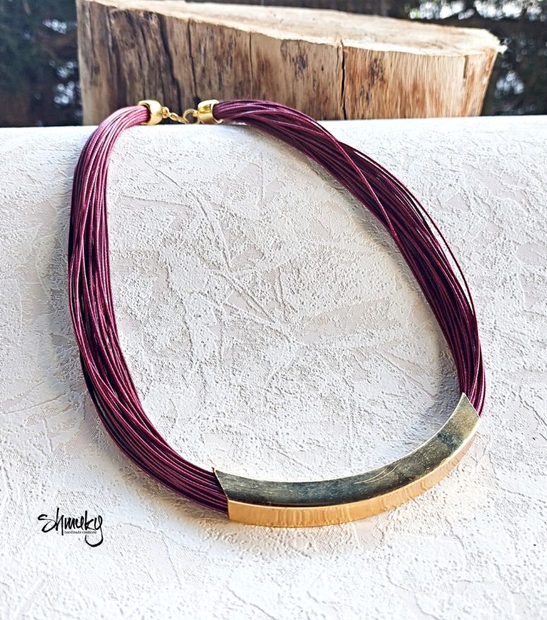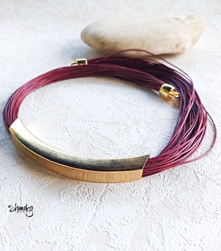 Nápadný náhrdelník z pogumovaných bižuterních šňůrek v karmínově červené barvě, které prochází kovovou hranatou trubičkou.