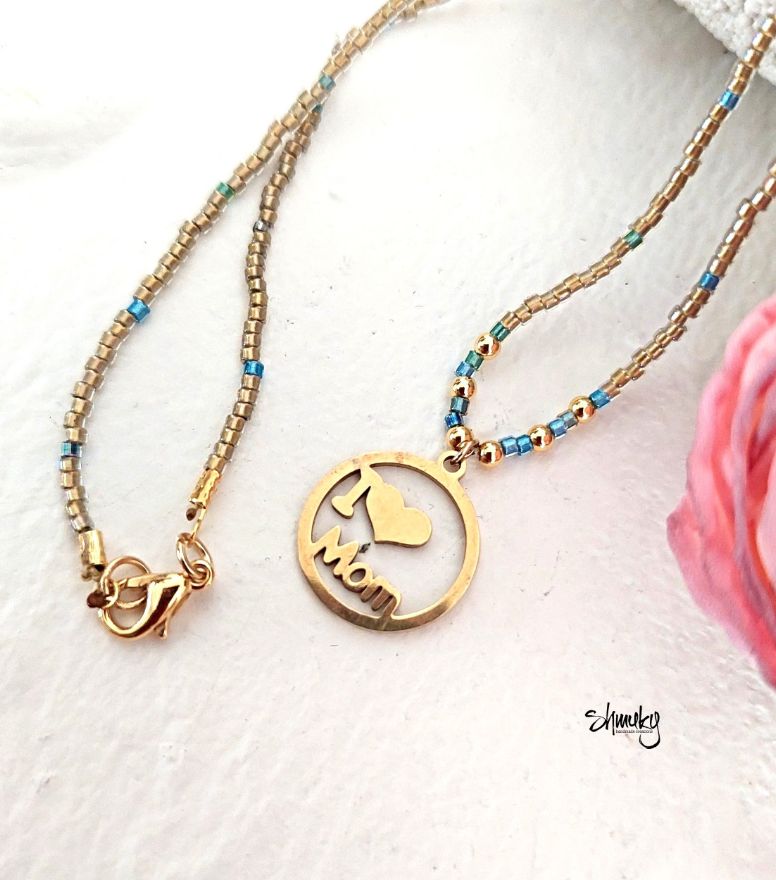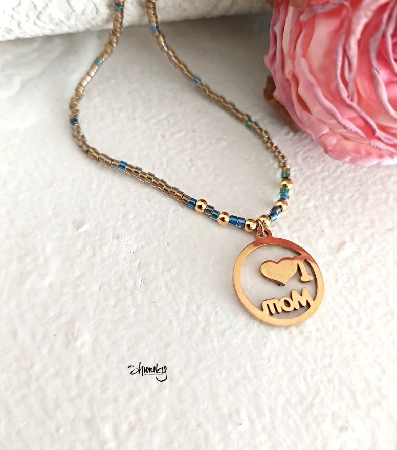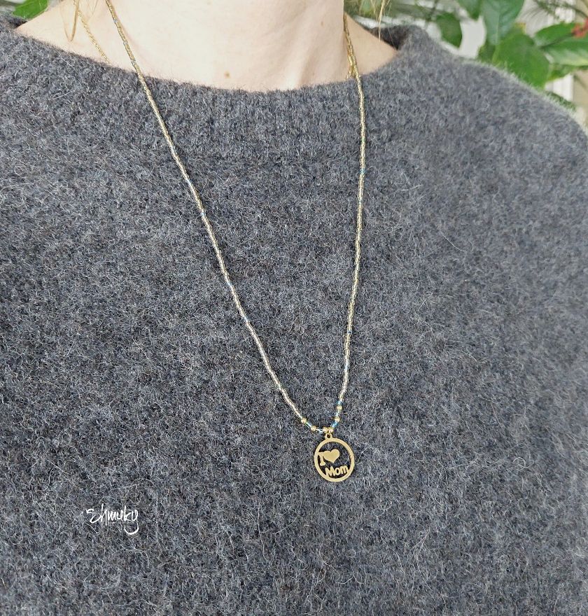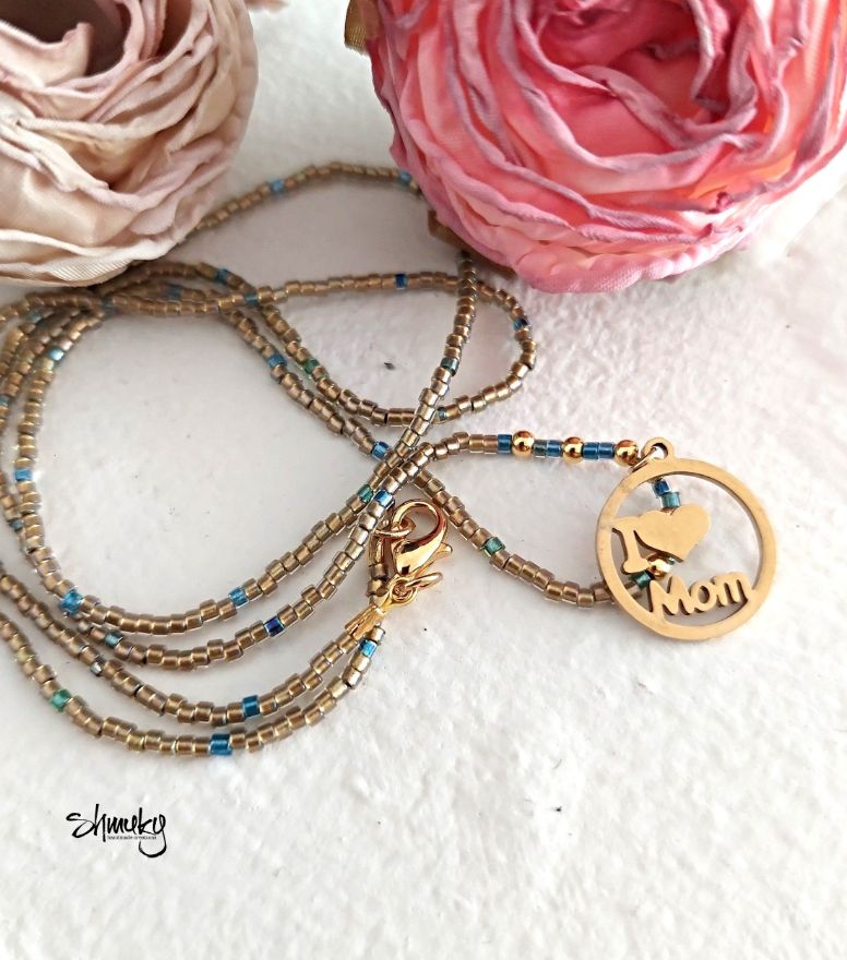 Jemný náhrdelník vyjadřující lásku k mamince. Tou je kovový přívěsek s motivem „I love mom“, který visí na řetízku z drobných japonských korálků ve zlatém odstínu, přerušovaných modrými korálky stejné kvality.