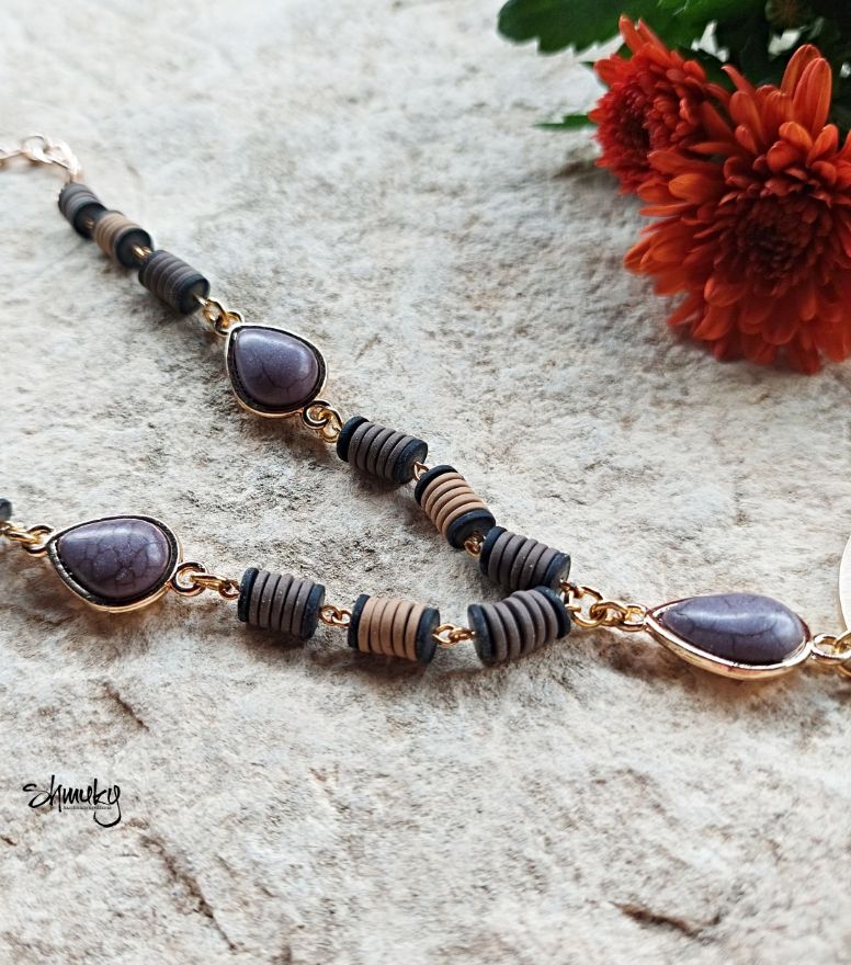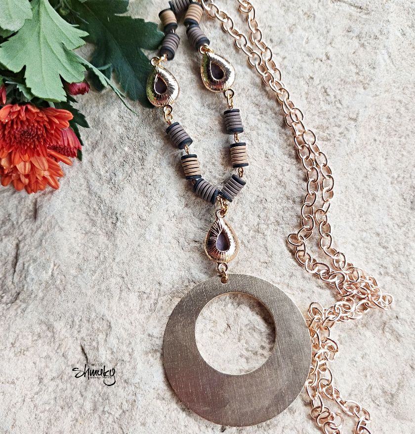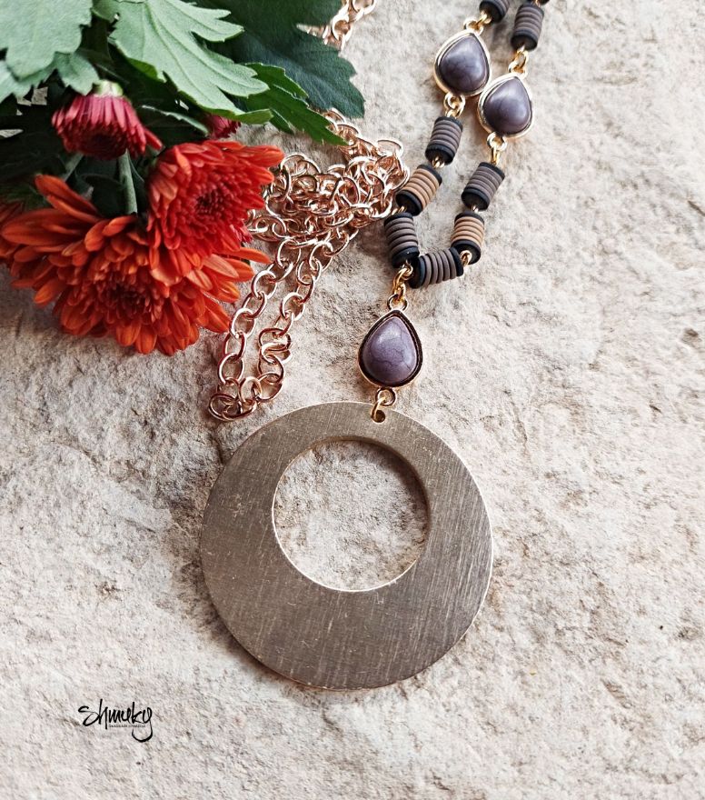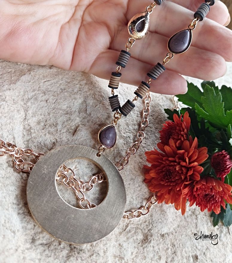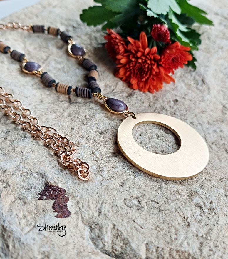 Dlouhý náhrdelník s kruhovým přívěskem, který visí na článkovém řetízku. Zavěsná část je navíc dozdobená komponenty ve tvaru slzy, u kterých je kovové lůžko vyplněno žíhanou šedou modelovací hmotou. K tomu barevně ladí články z plochých korálků. Kovové části náhrdelníku jsou v barvě světlého růžového zlata.