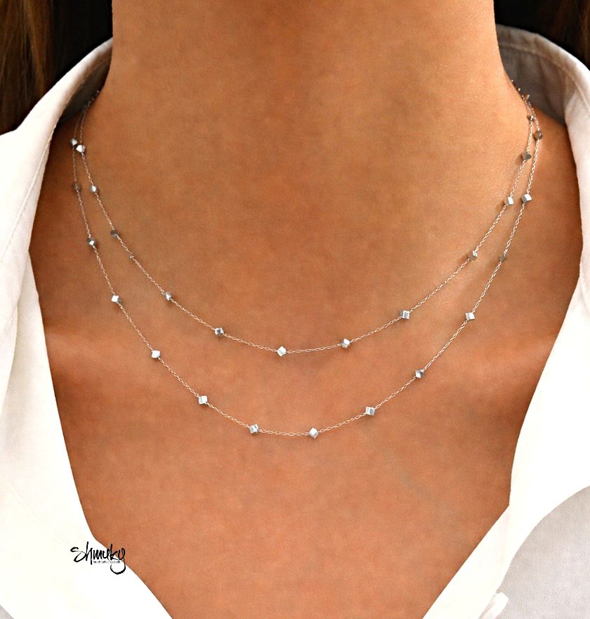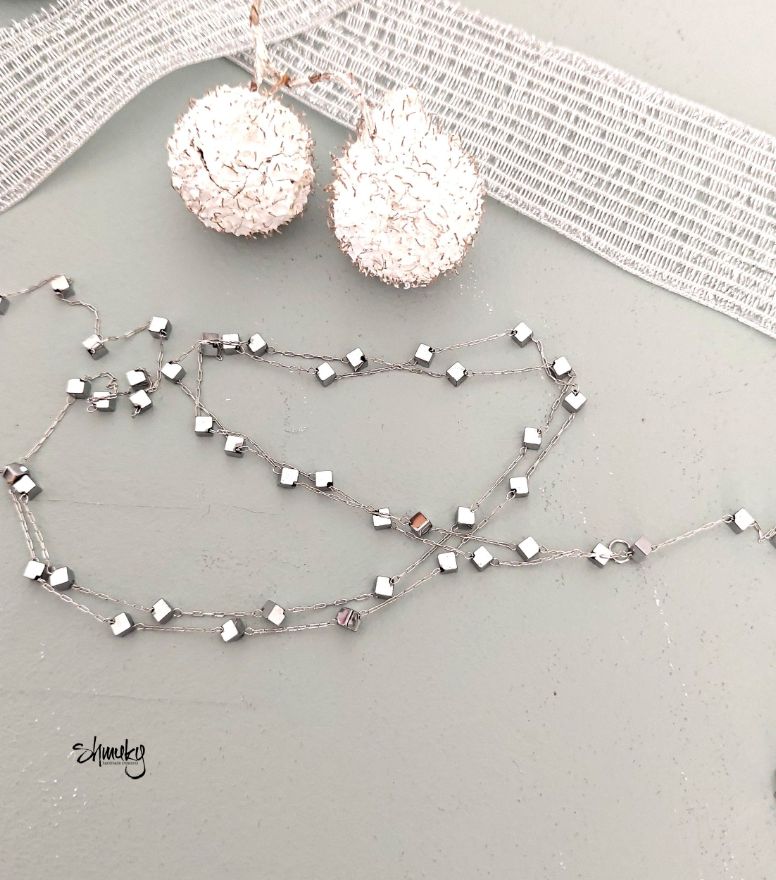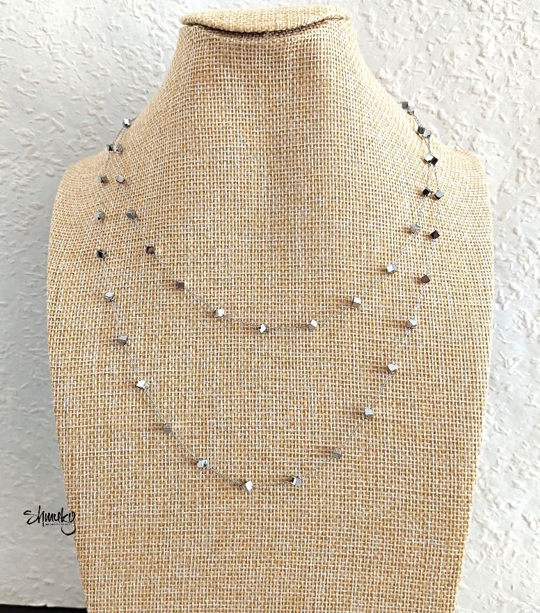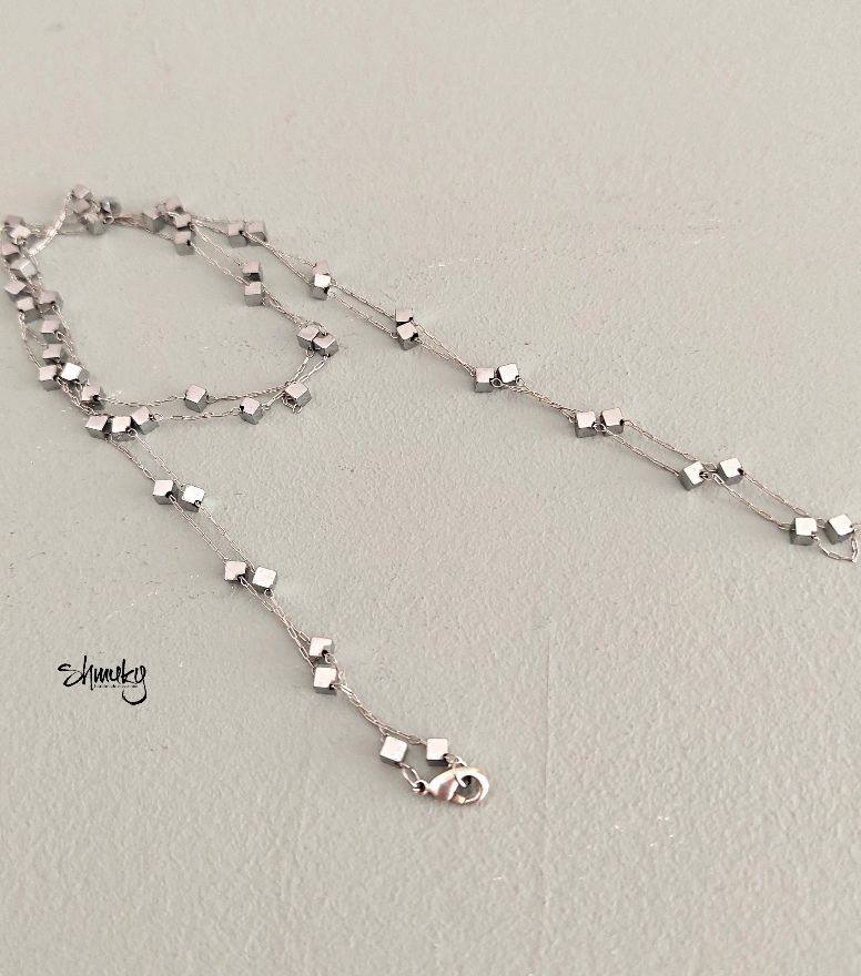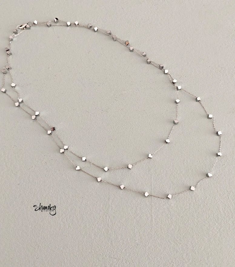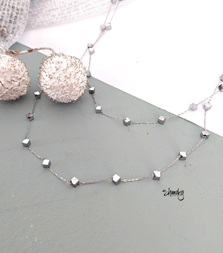 Delší náhrdelník z jemného stříbrného řetízku je zdobený kostičkami /velikost strany 0,5 cm/ z postříbřeného hematitu.