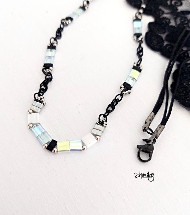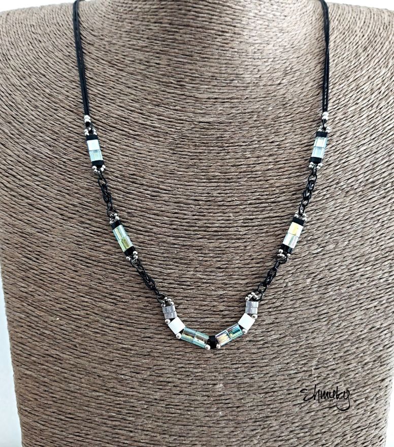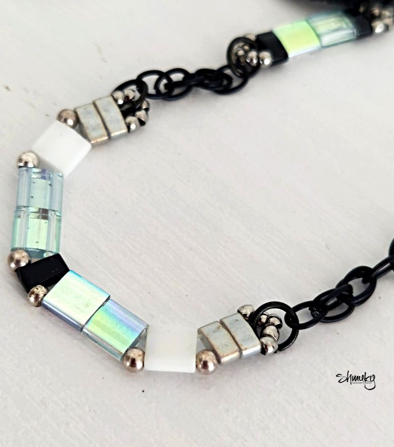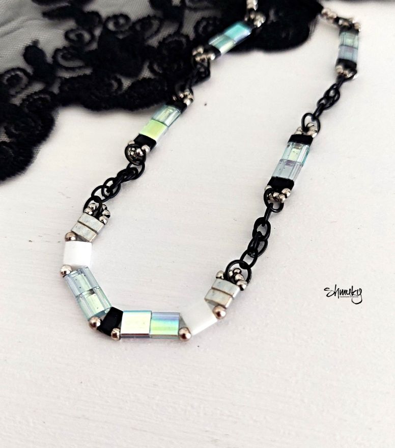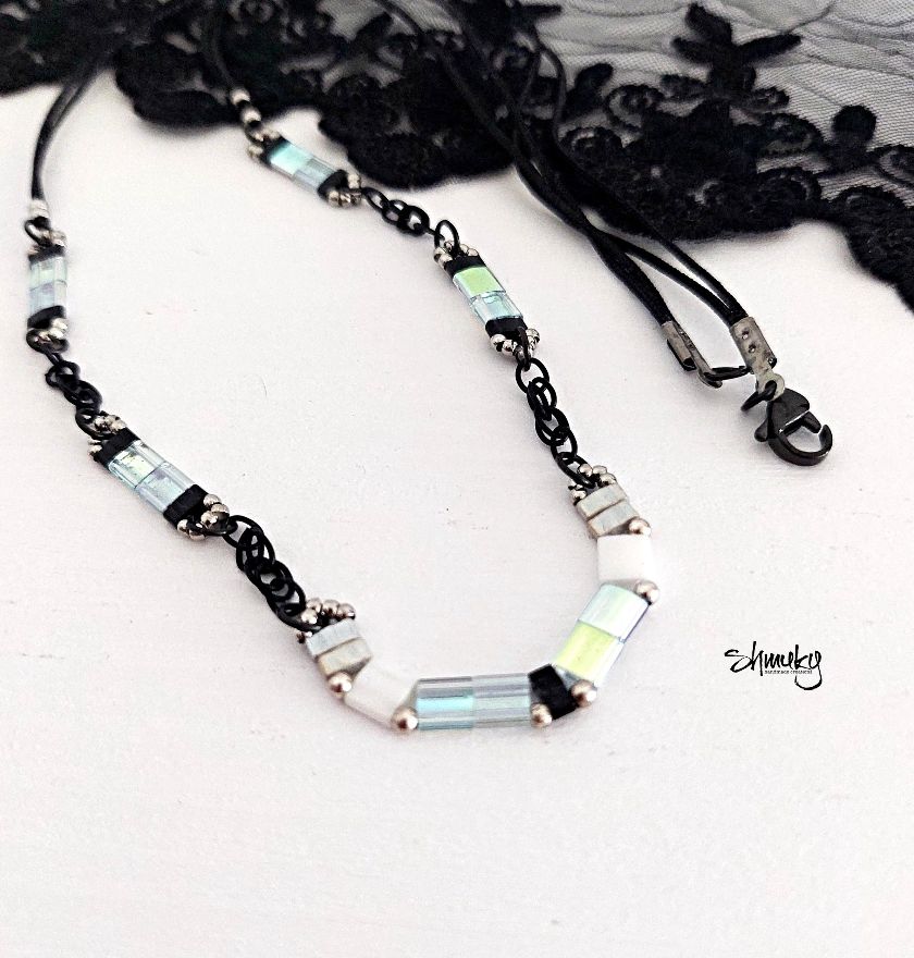 Náhrdelník je vyrobený z japonských plochých korálků Tila, ozdobného černého řetízku a černé šňůrky. Z křišťálově zelenkavých, bílých a šedých korálků jsem vytvořila články, které jsou spojené řetízkem. Články jsou dlouhé 2 cm, v podobném duchu vznikl také středový komponent ve tvaru půlkruhu.