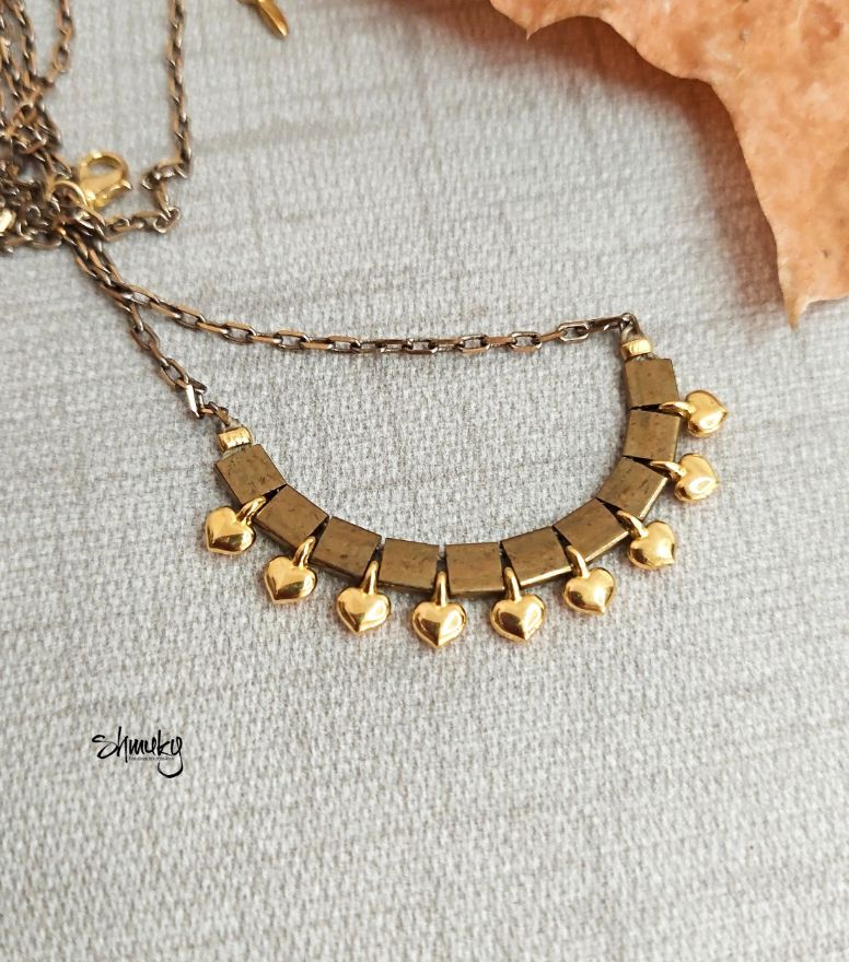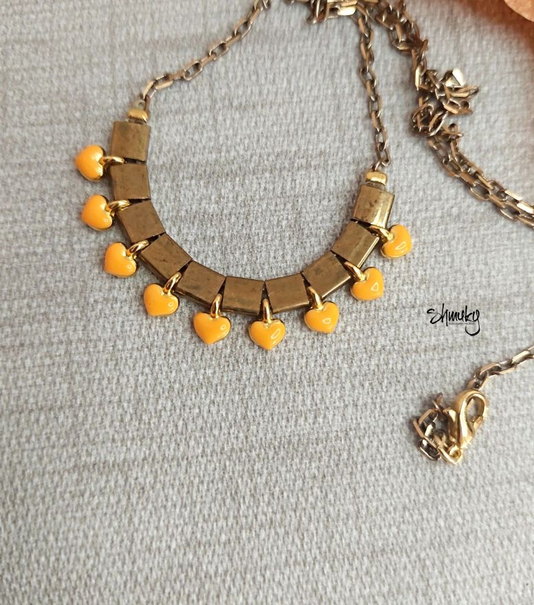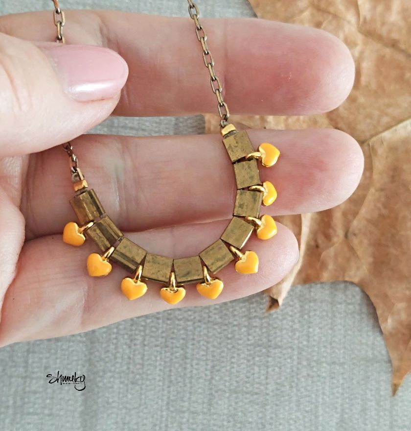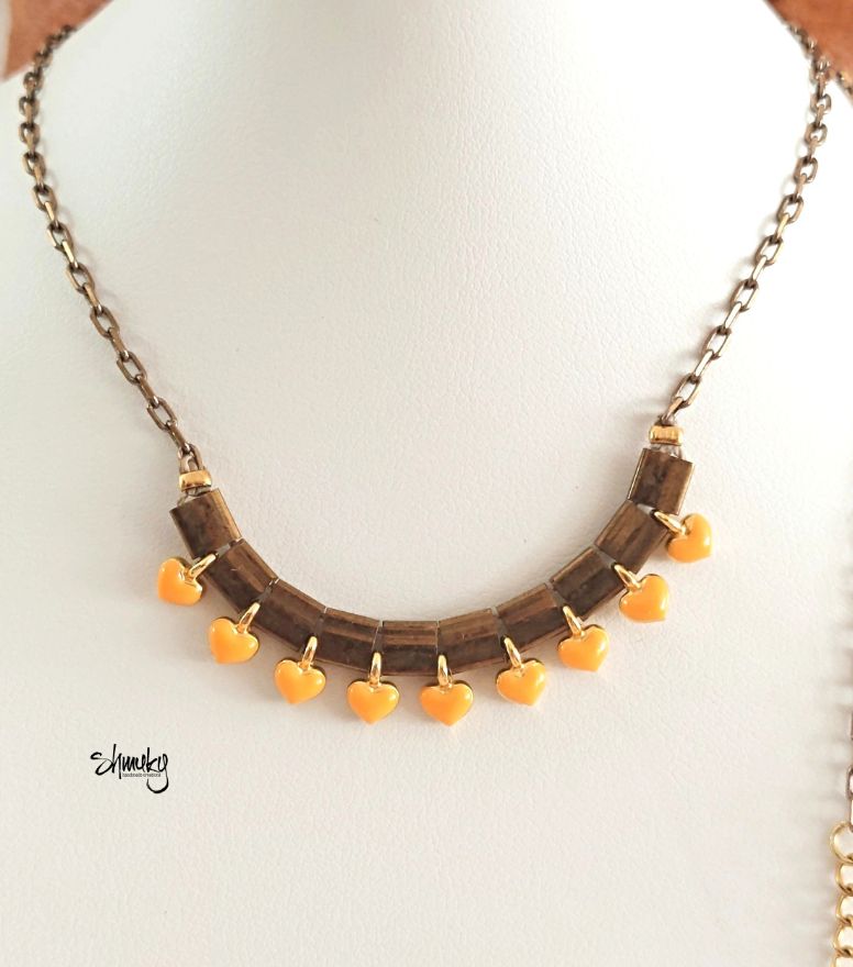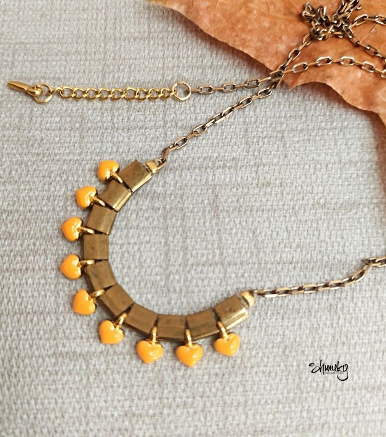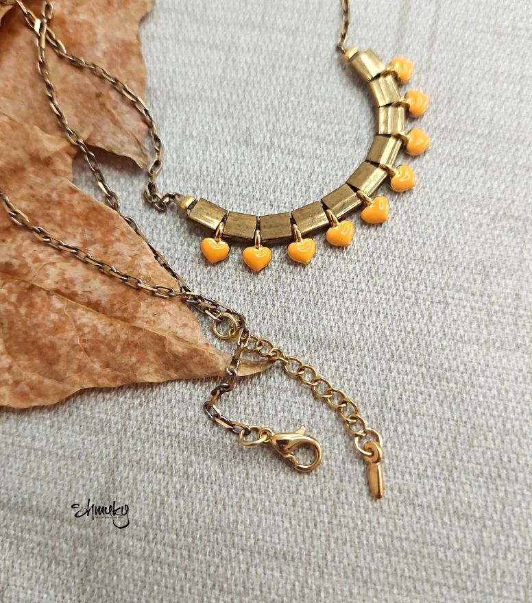 Mosazný řetízek zdobí půlkruh z plochých korálků Tila v mosazné barvě, mezi kterými visí kovová srdíčka s oranžovým emailovým povrchem.