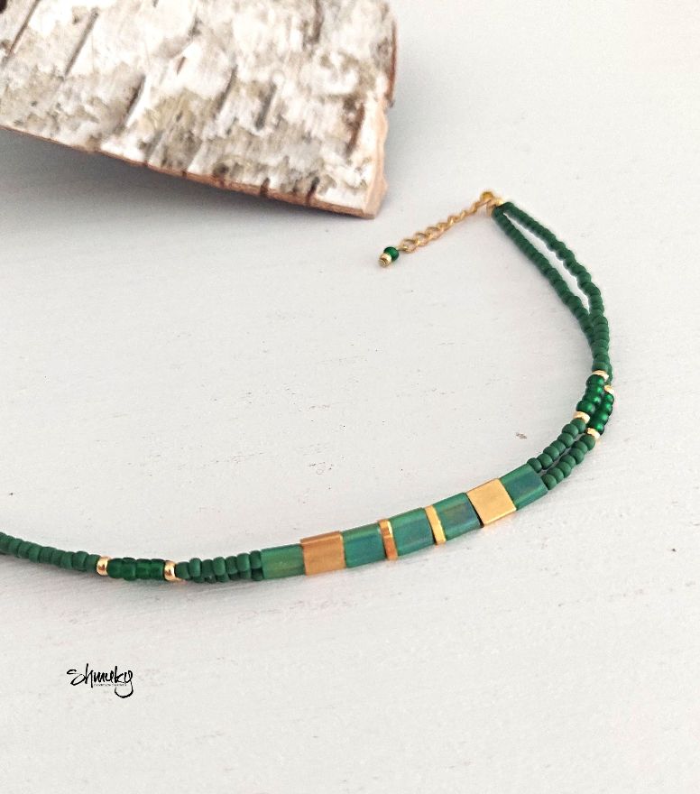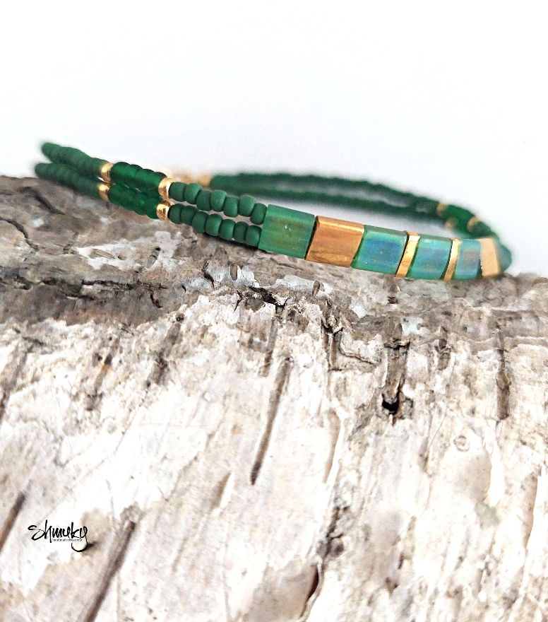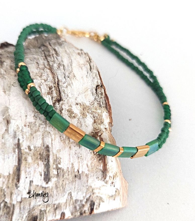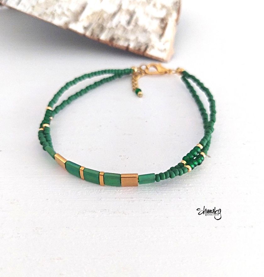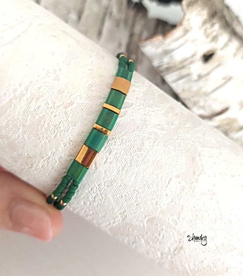 Jemný dvojitý náramek vyrobený z kvalitních japonských korálků Tila a Toho. Korálky jsou navléknuty na pevném bižuterním lanku, díky kterému náramek dobře drží tvar a je pohodlný na nošení. Barevná kombinace tmavě zelené a zlaté působí elegantně a nadčasově.
