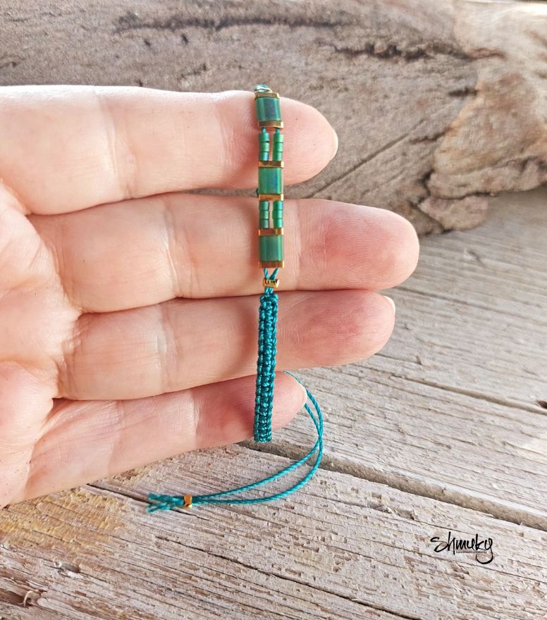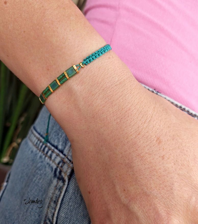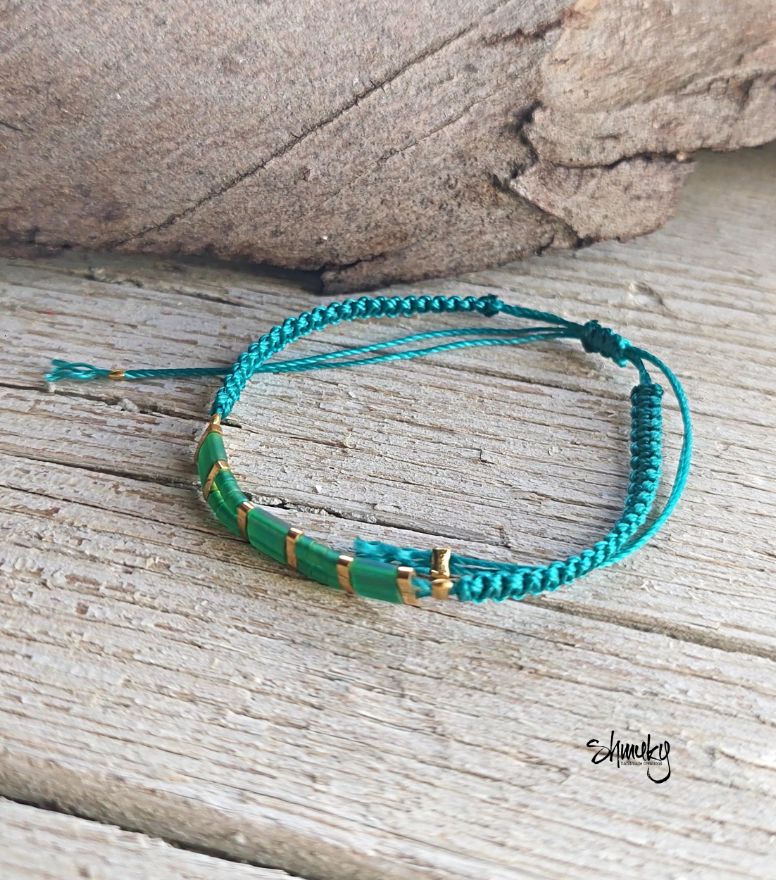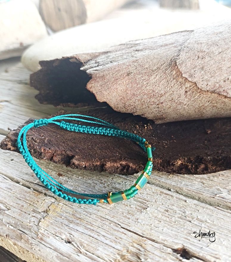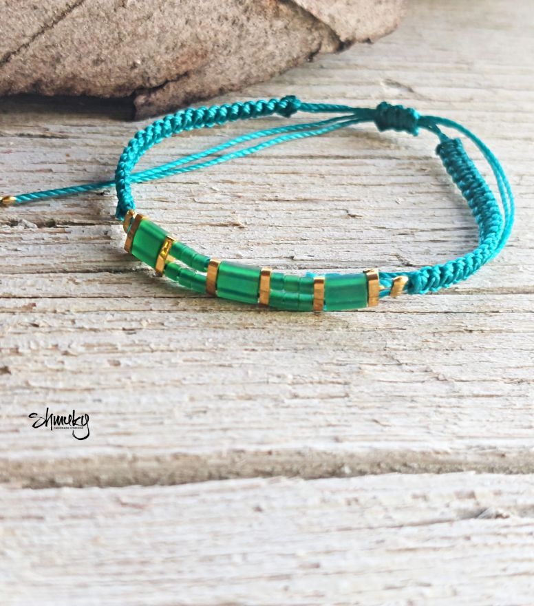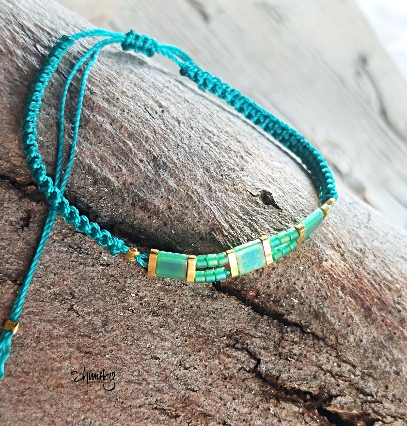 Tyrkysový makramé náramek, který zdobí ve středové části korálky Tila a Miyuki, barevně ladící se šňůrkou.
