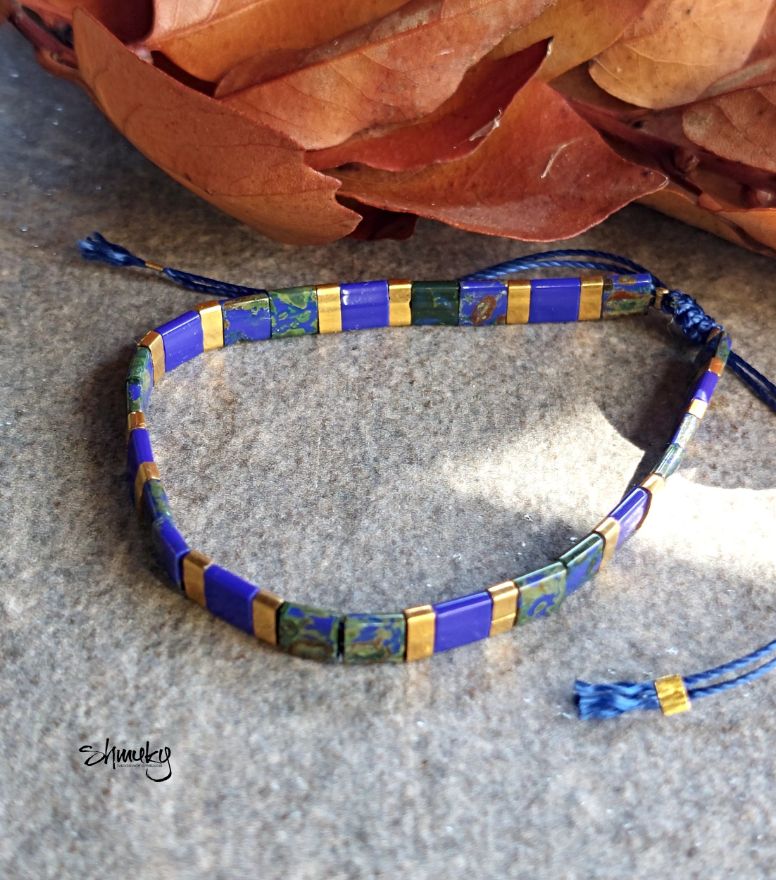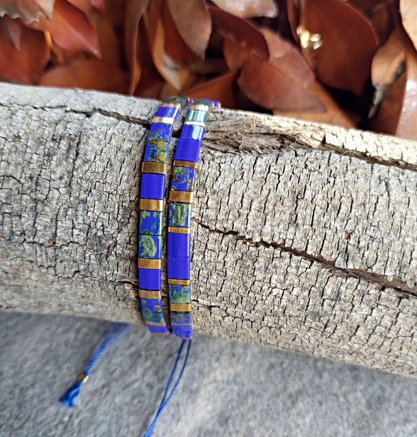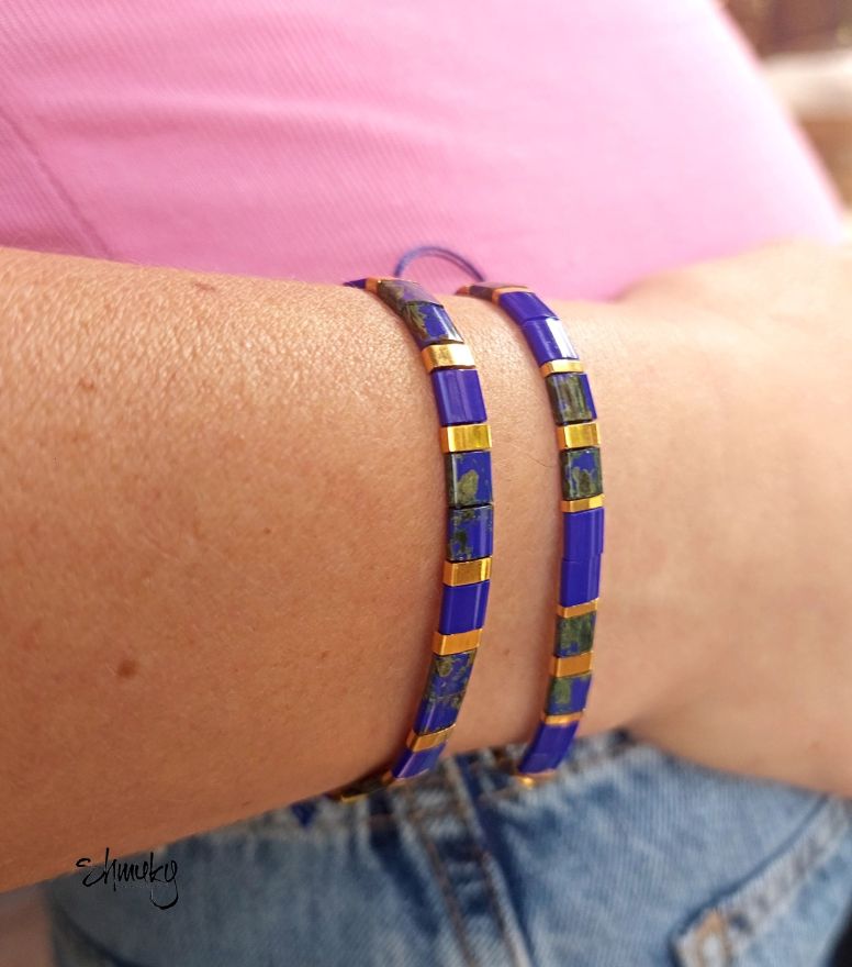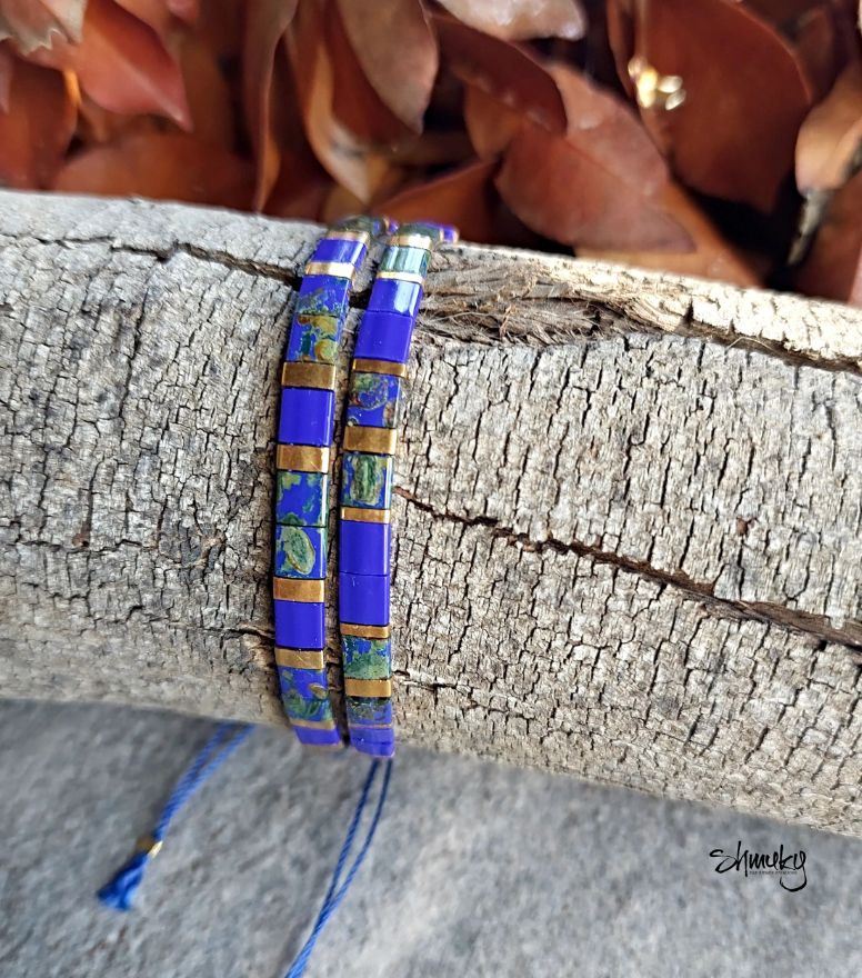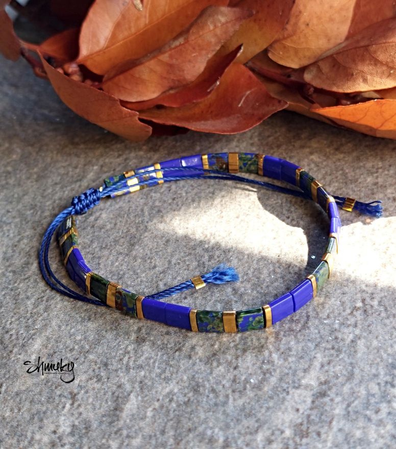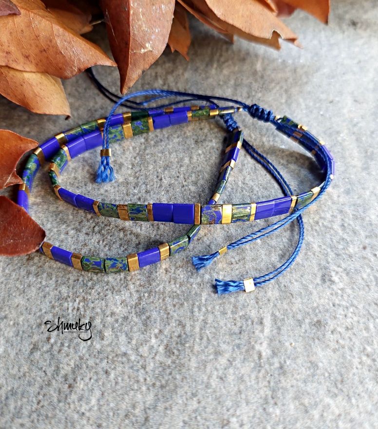 Set dvou náramků z plochých japonských korálků v barevné kombinaci modrá a zlatá, které jsou navléknuty na modré šňůrce.