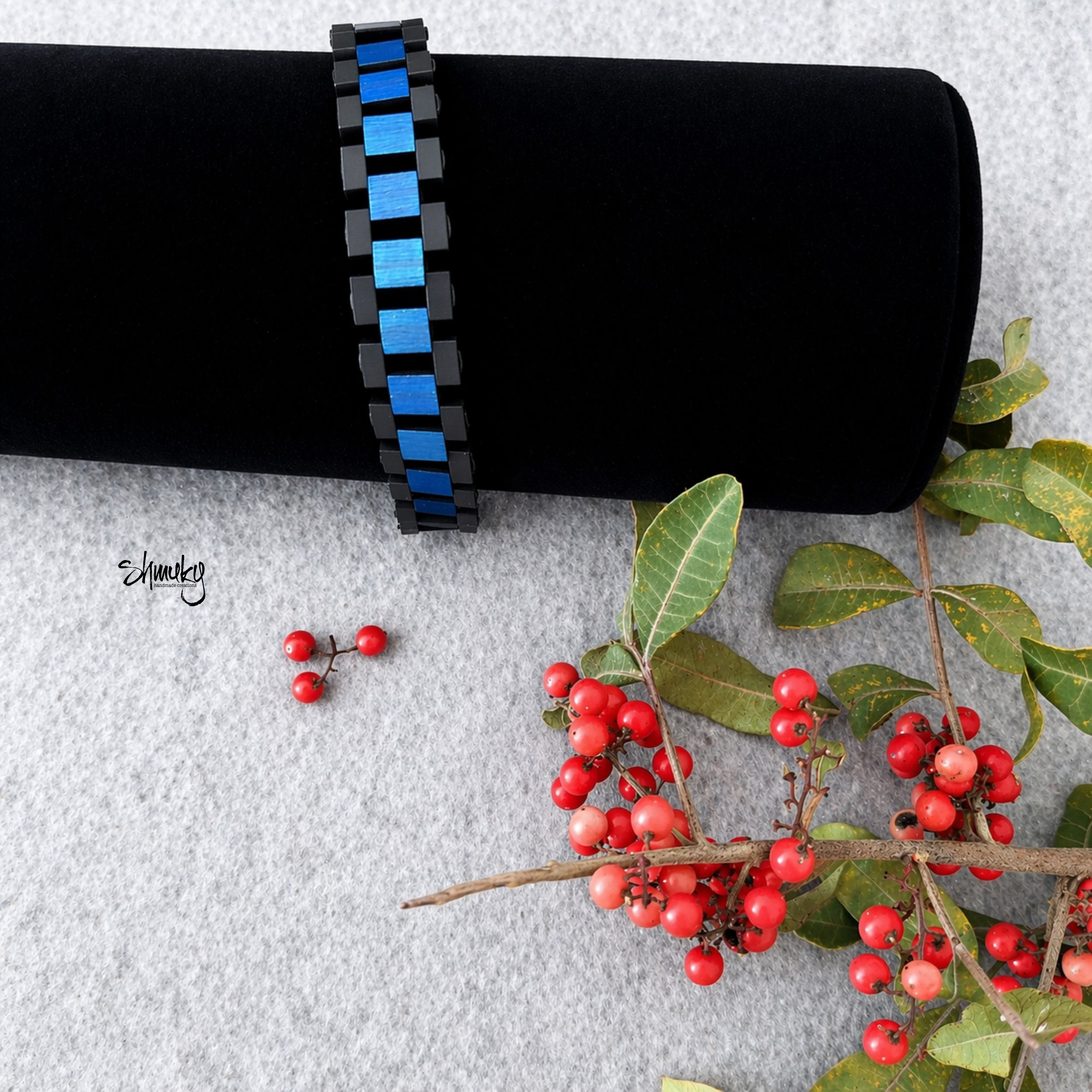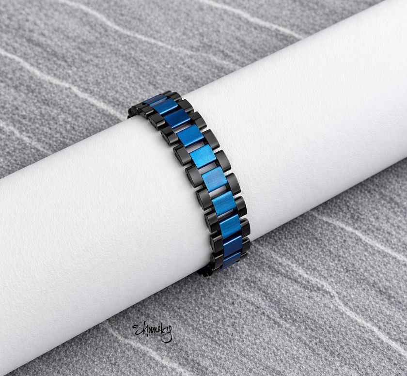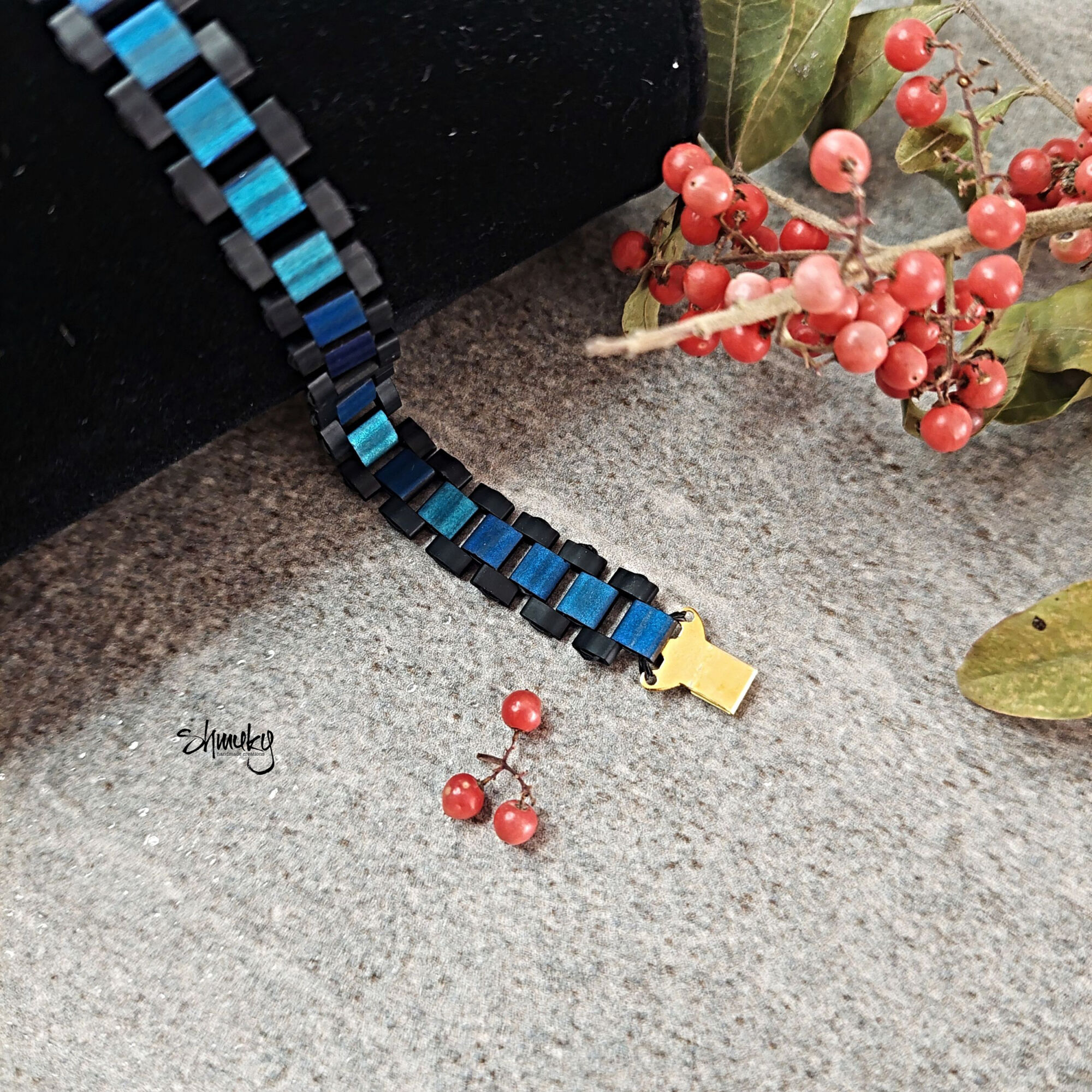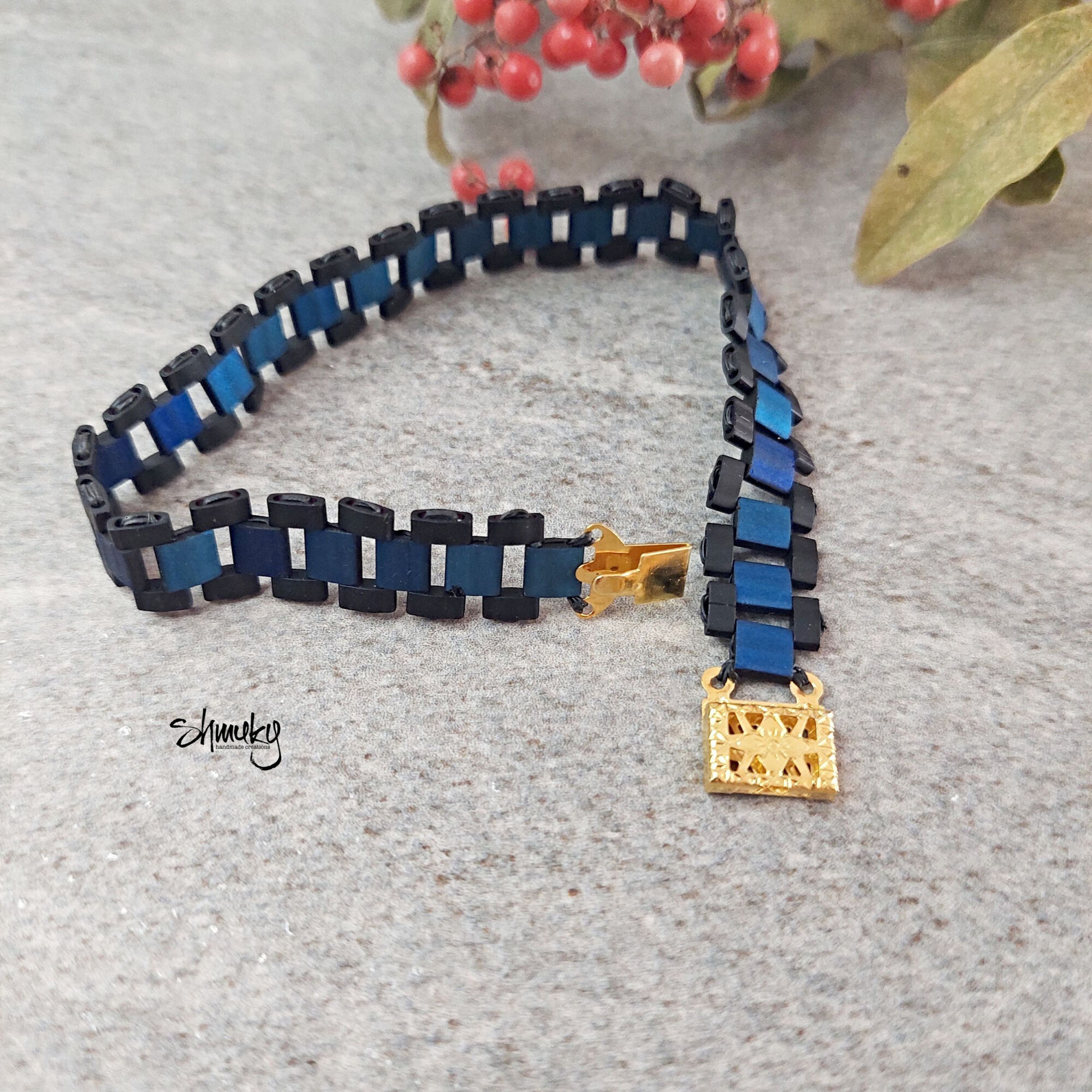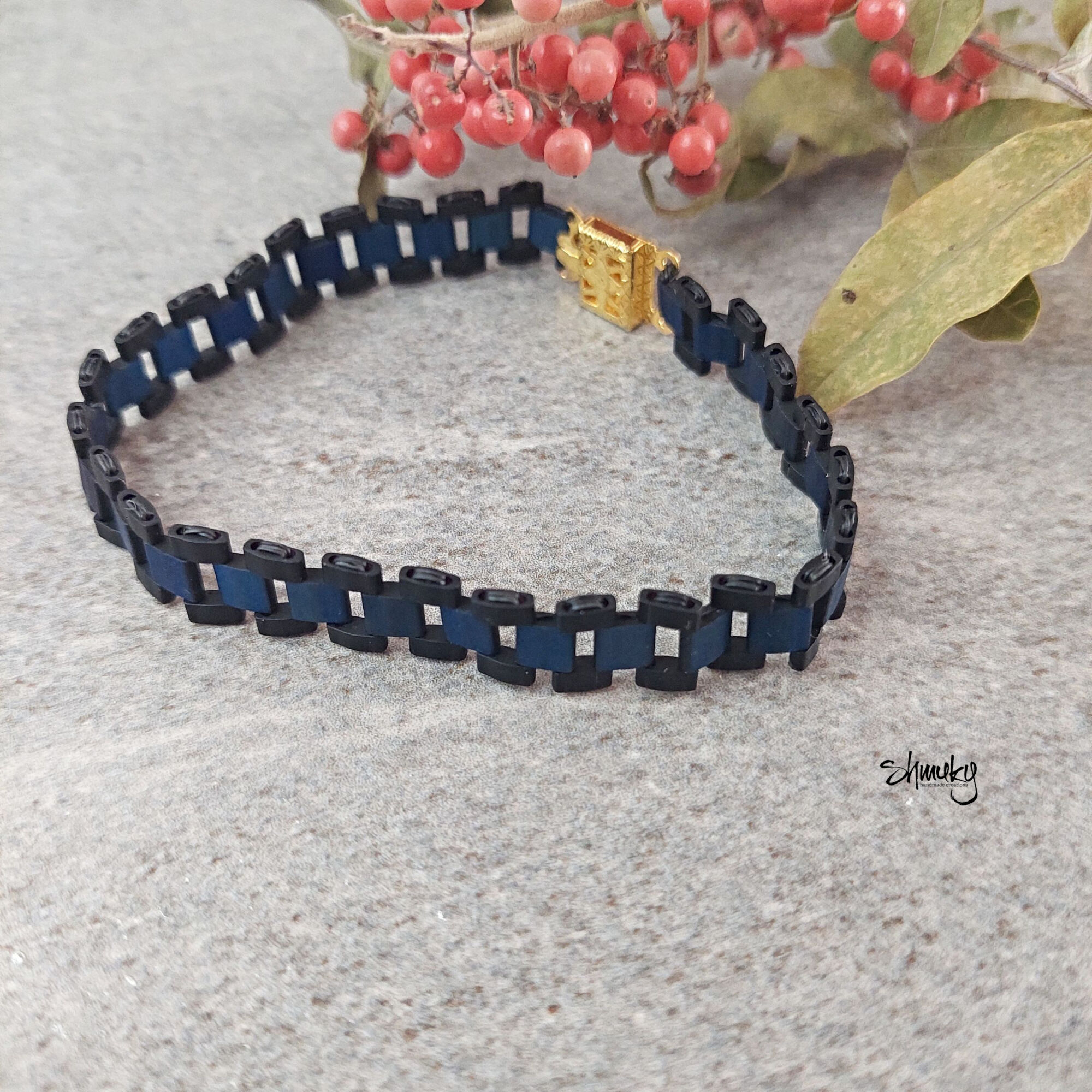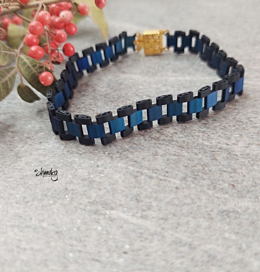 Elegantní náramek z japonských korálků Tila v kombinaci tmavě modré a černé barvy. Moderní článkový design působí čistě, stylově a zároveň originálně. Díky lehkému materiálu je náramek velmi pohodlný na každodenní nošení.