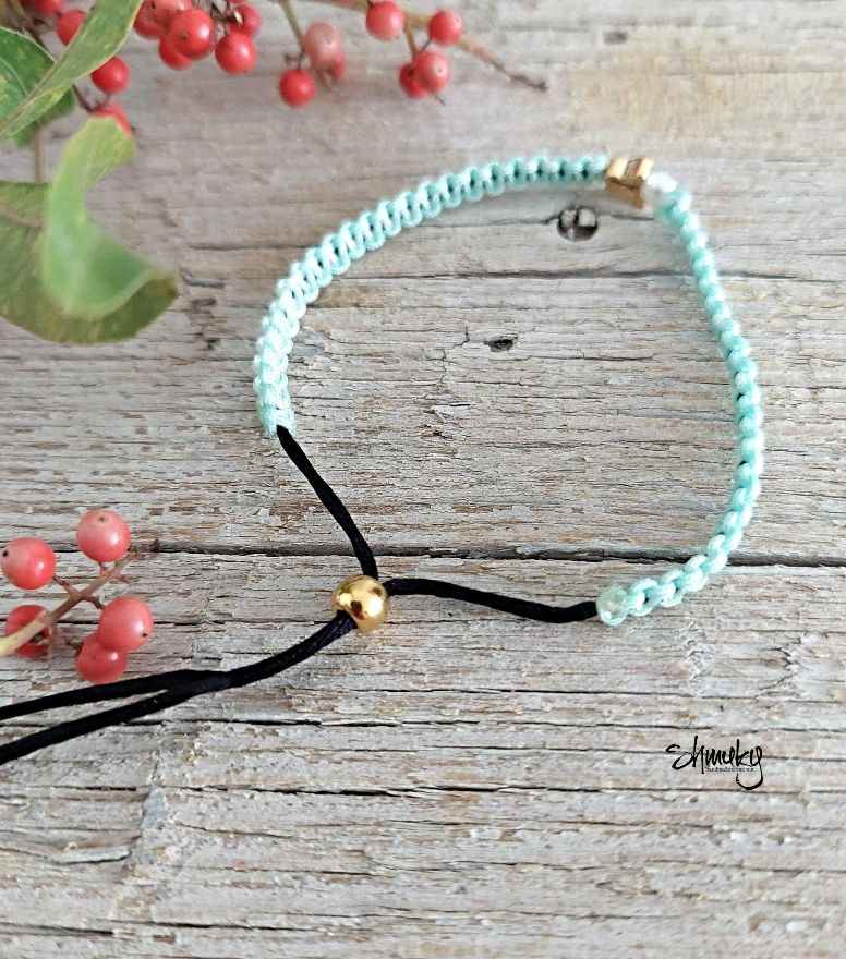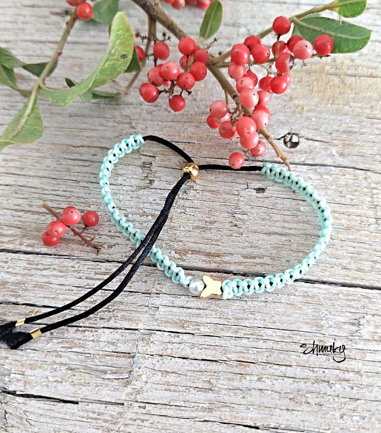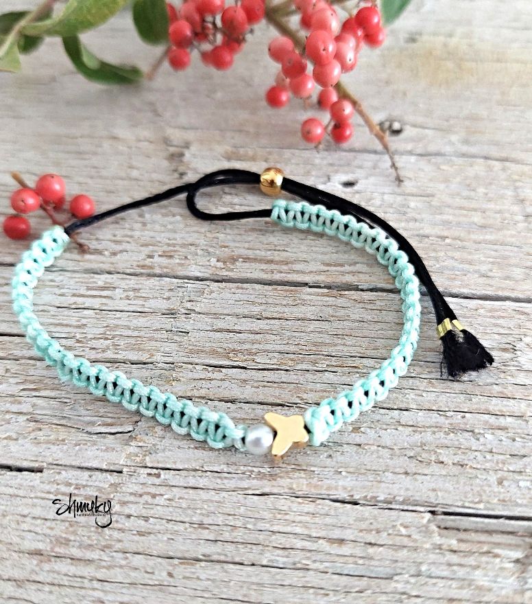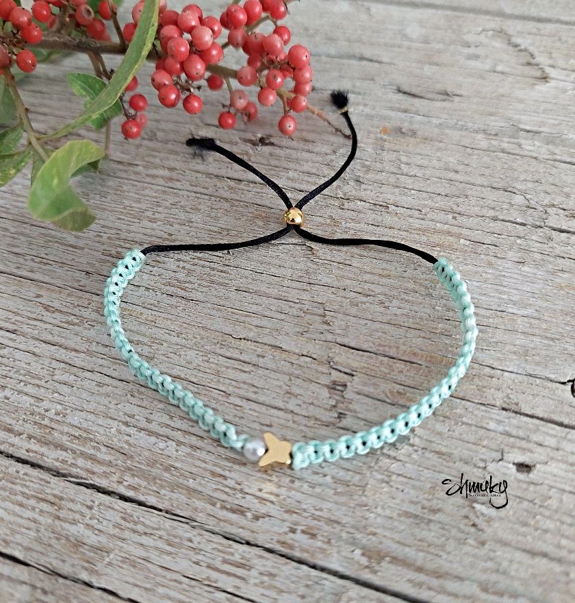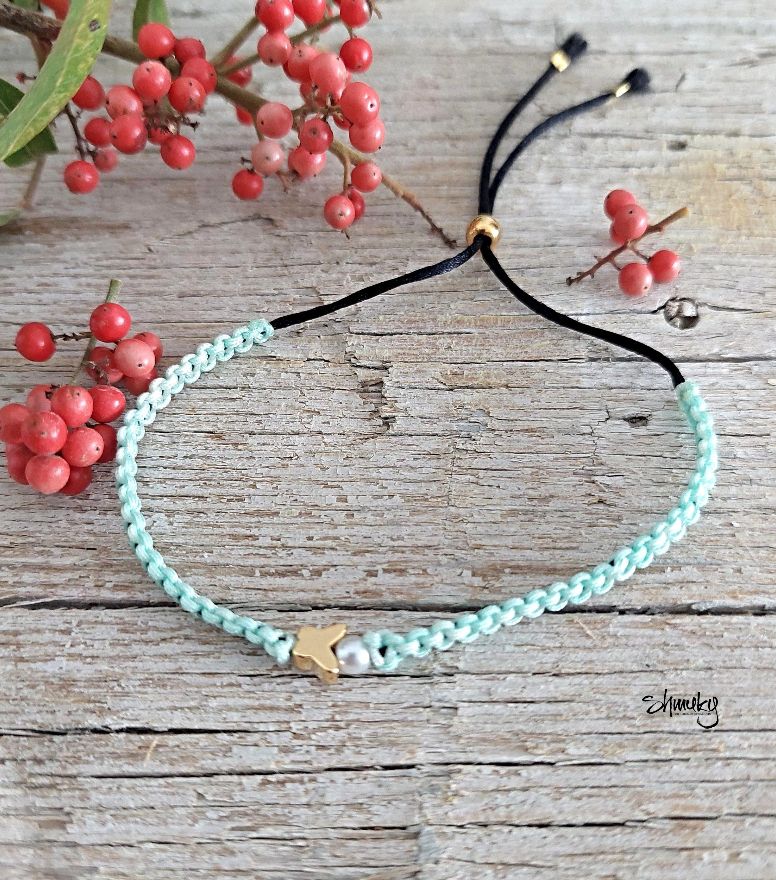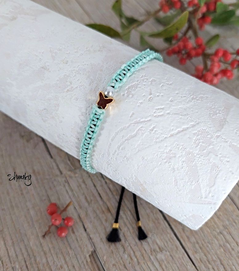 Jemný makramé náramek v pastelově mátové barvě je ručně pletený z tenké šňůrky a má jednoduchý, elegantní vzor. Uprostřed se nachází malý zlatý přívěsek ve tvaru motýlka doplněný drobnou akrylovou perličkou.