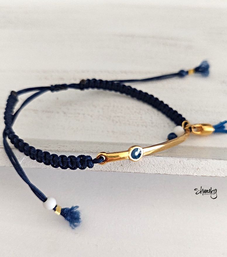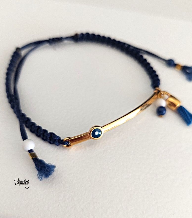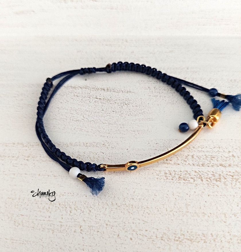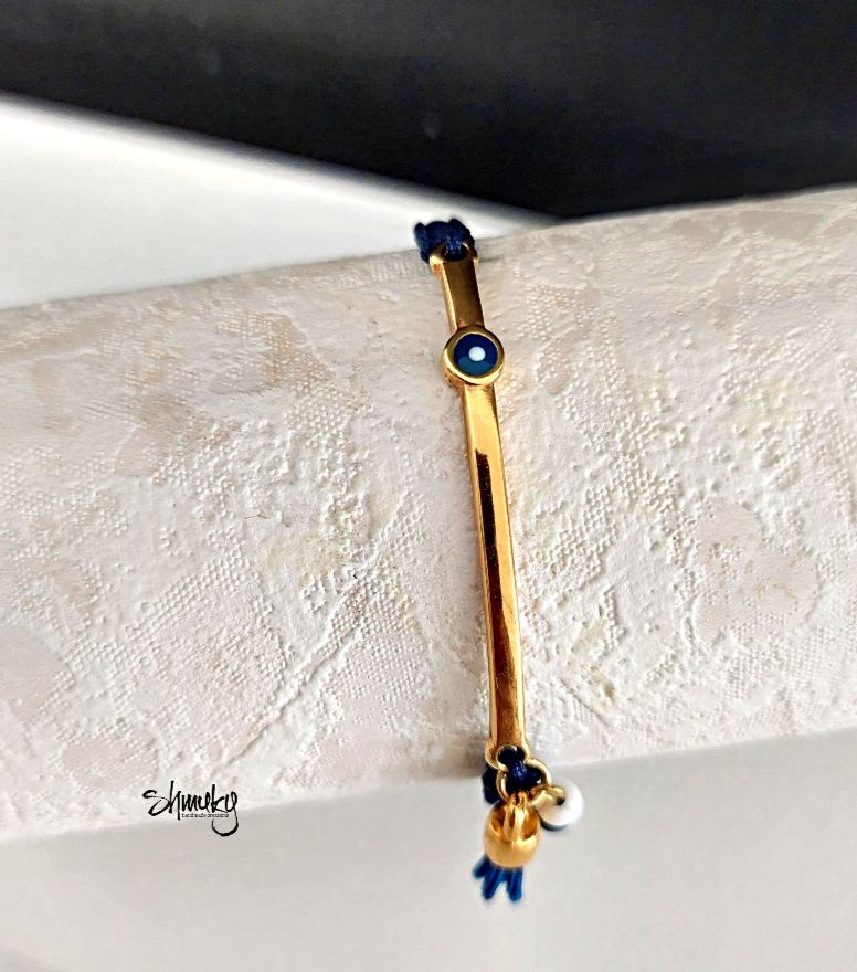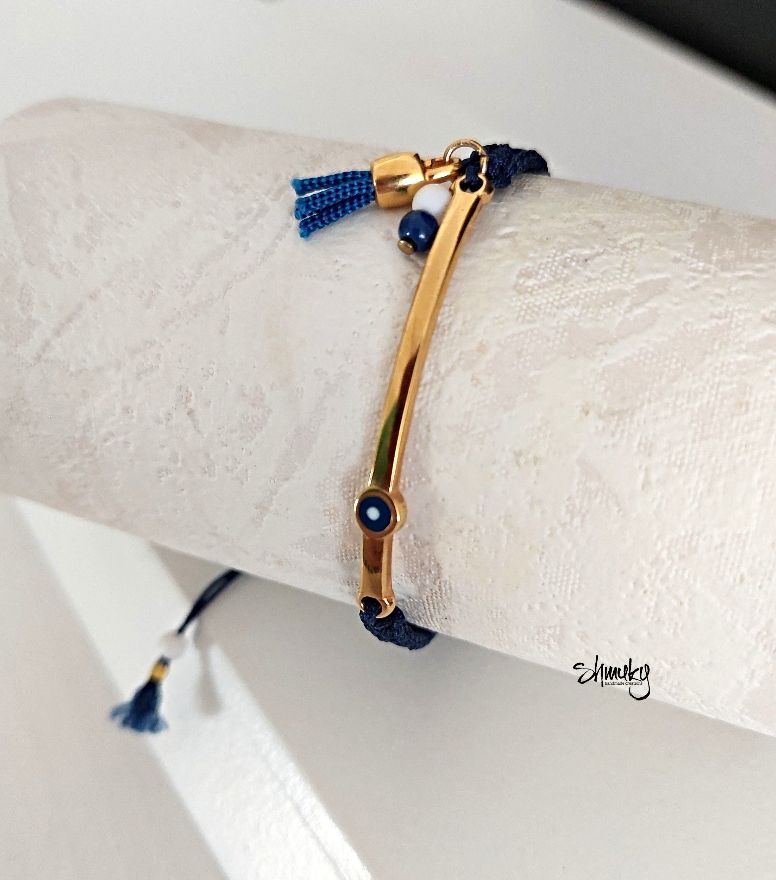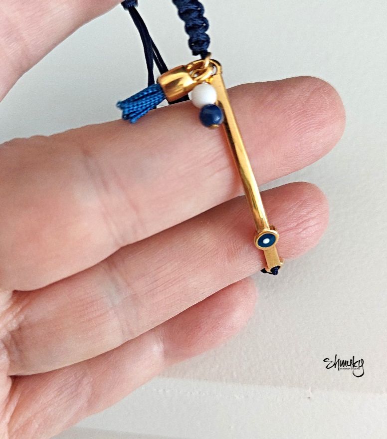 Náramek se středovým kovovým komponentem z kvalitní bižuterní slitiny zdobí modrý motiv „bad eye“, ručně vyrobený střapeček a korálky ve stejné barvě. Délka zahnutého komponentu je 4,5 cm.