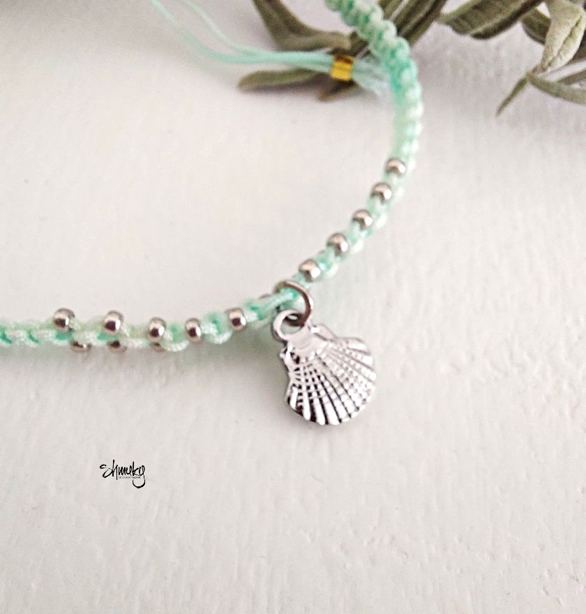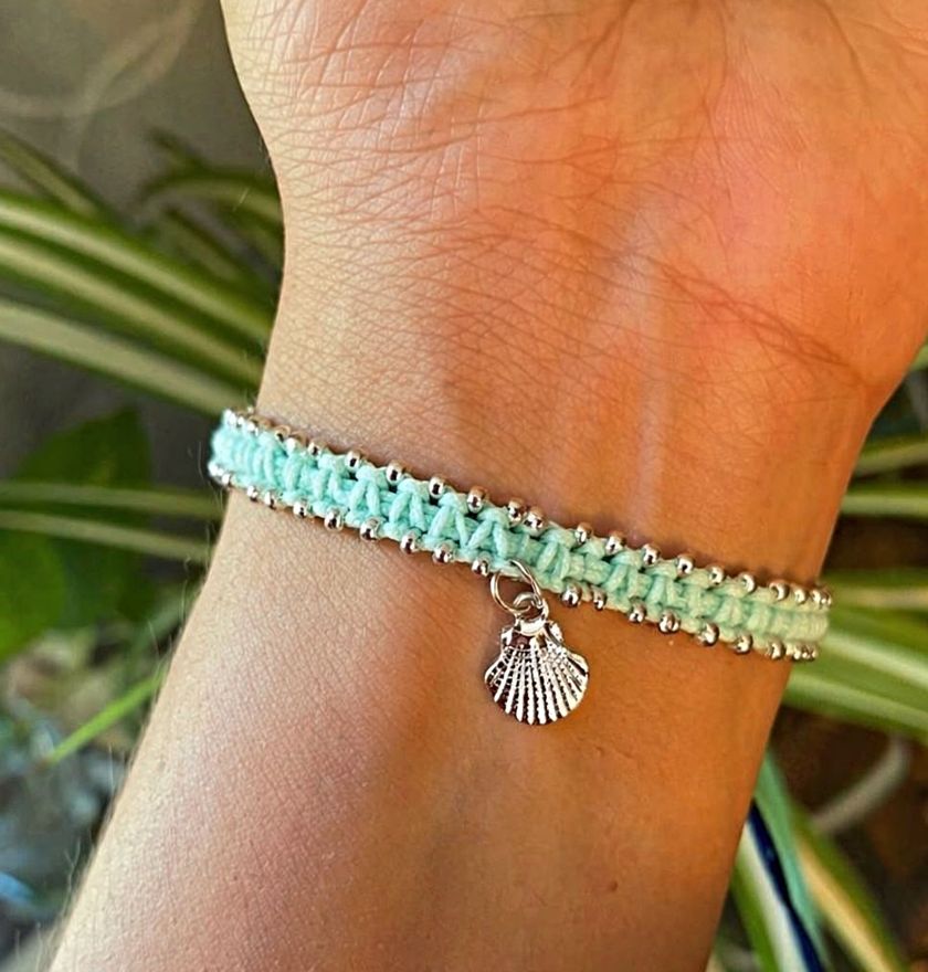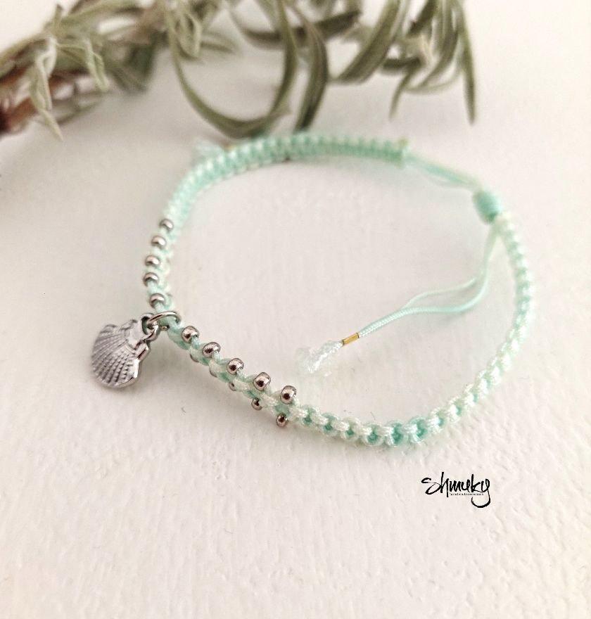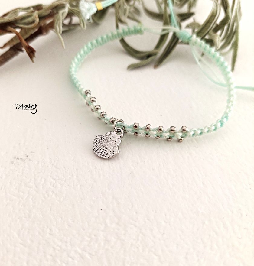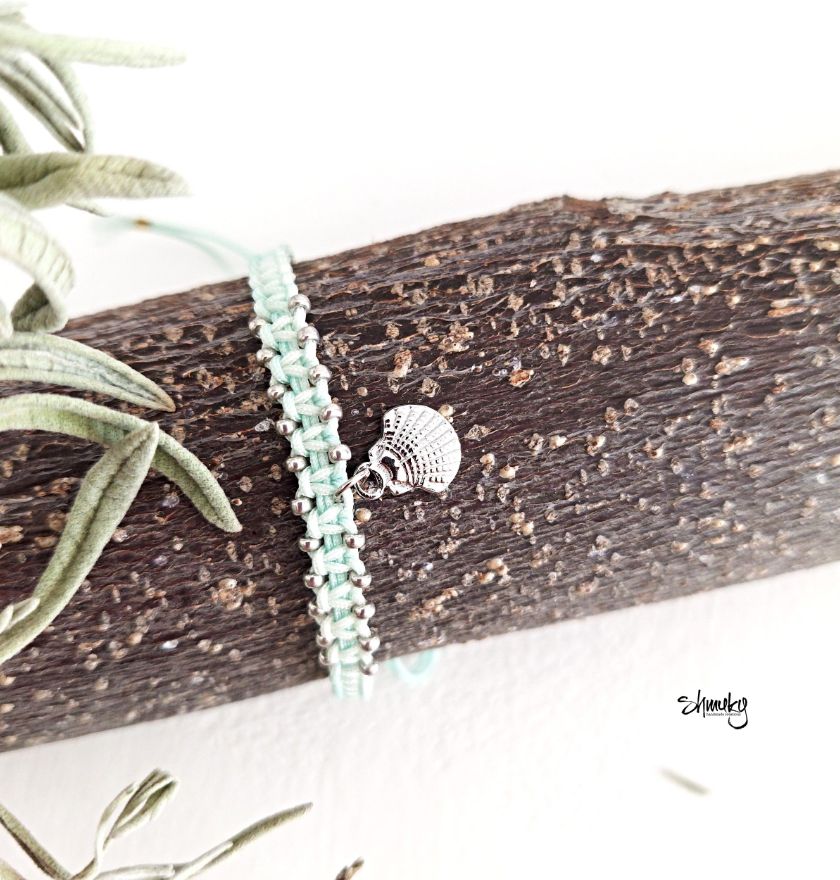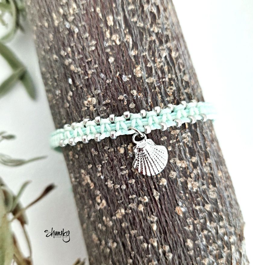 Jemný ručně vyrobený náramek je upletený ze světle mentolové šňůrky a zdobený drobnými stříbrnými korálky po okraji. Uprostřed visí drobný stříbrný přívěsek ve tvaru mušle, který dodává náramku lehký letní a přírodní nádech.