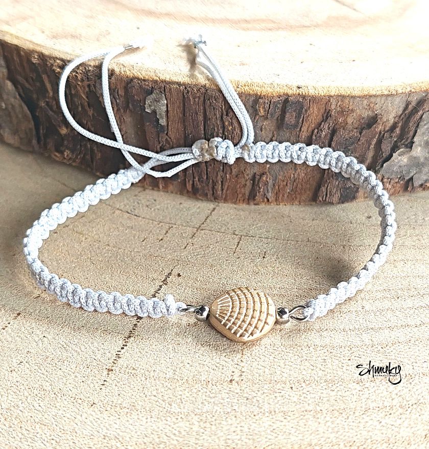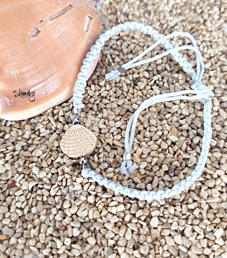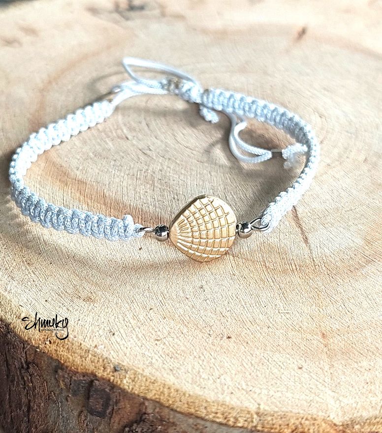 Barevná kombinace světle šedá se zlatou patří k nejnovějším módním trendům. Motiv světle zlaté lastury jsem pro jeho zvýraznění připevnila na světlé makramé.
