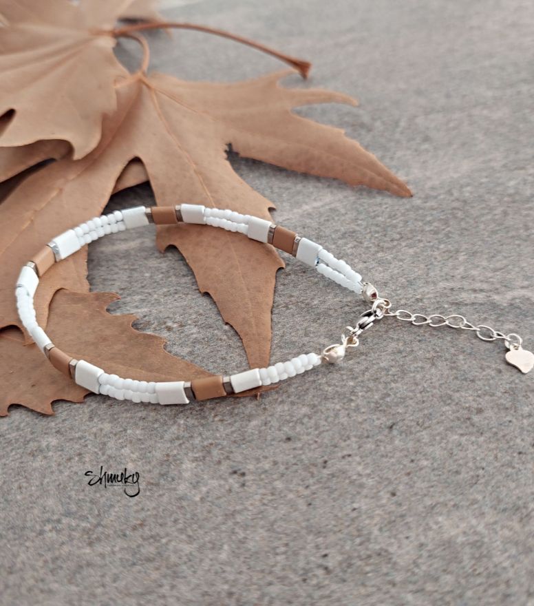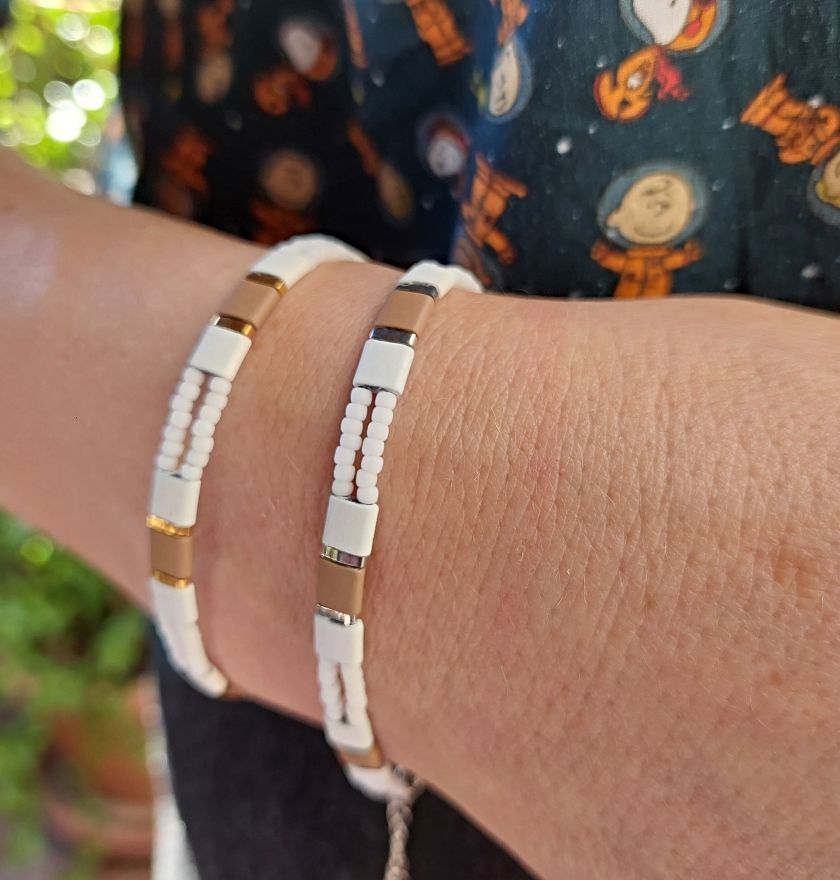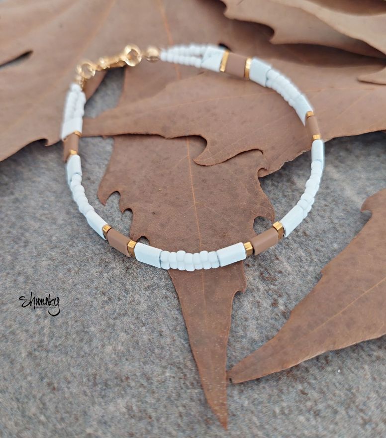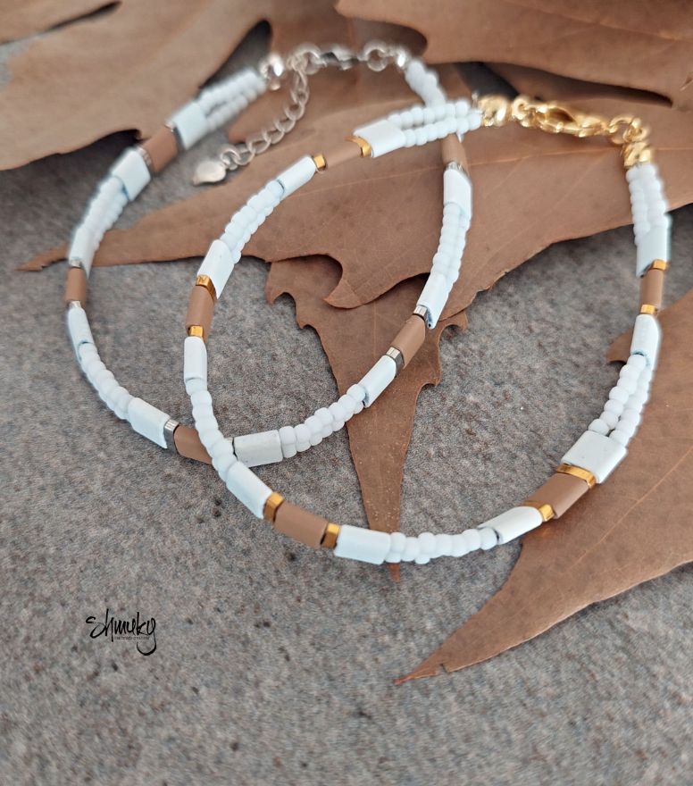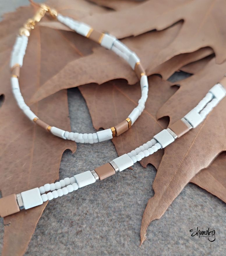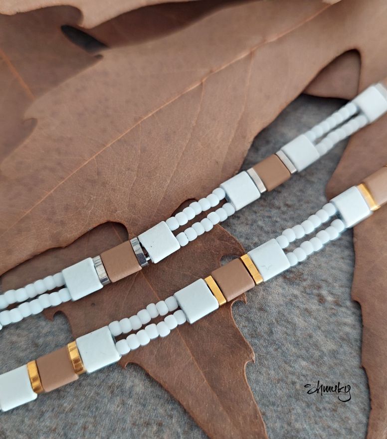 Barevná kombinace bílá a světle hnědá patří k elegantním volbám při výběru doplňků ke každodennímu outfitu, obzvlášť když jsou je ještě oživená zlatou nebo stříbrnou. Na výrobu těchto náramků jsem použila drobné japonské korálky, ploché korálky ze syntetického hematitu a korálky typu Tila.