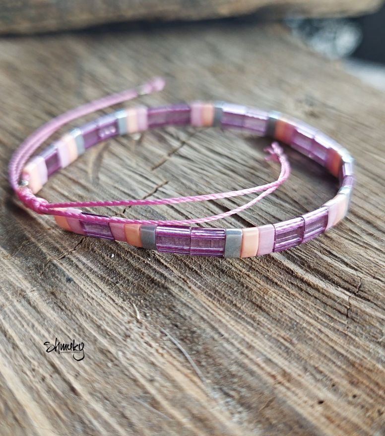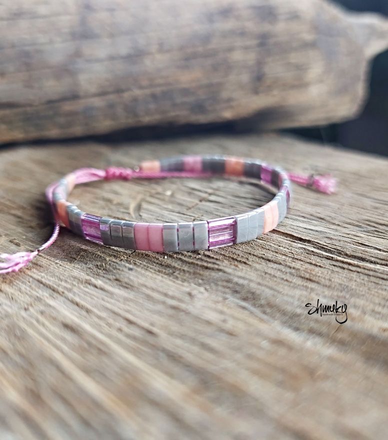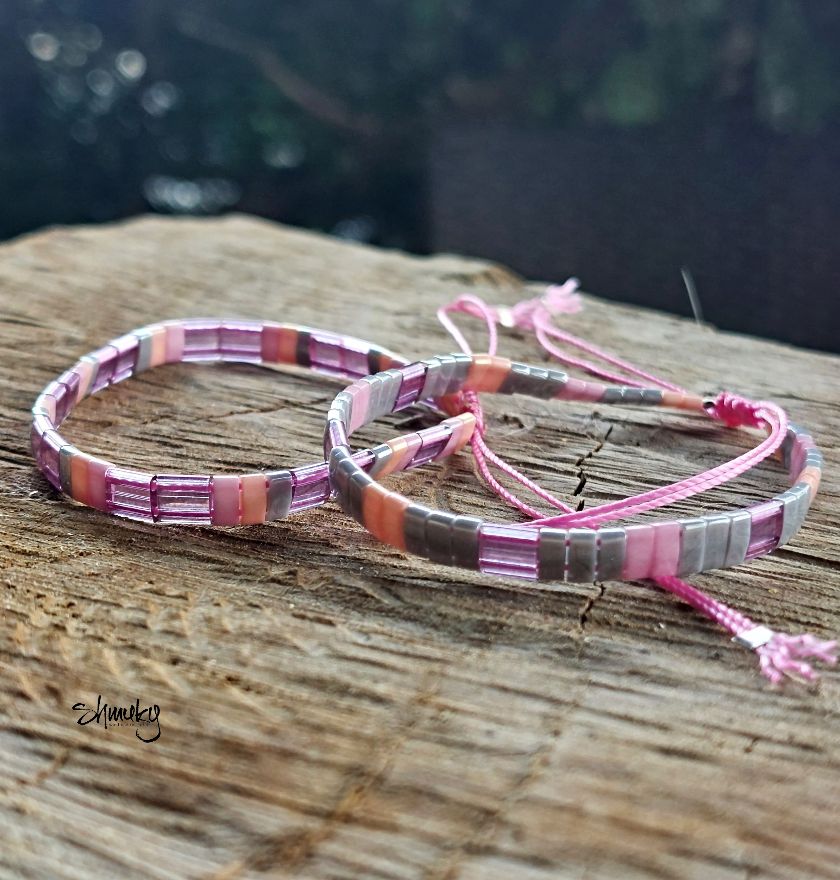 Set dvou náramků z plochých korálků Tila v barevné kombinaci šedá, lososová, fialová a růžová jsou navléknuty na růžové šňůrce.