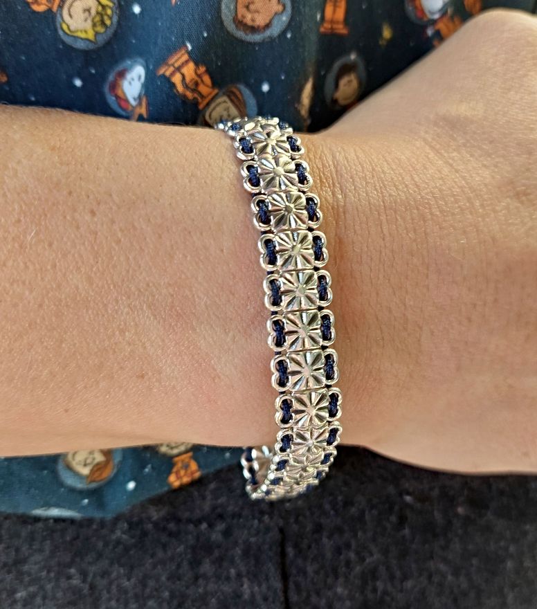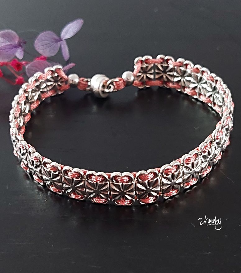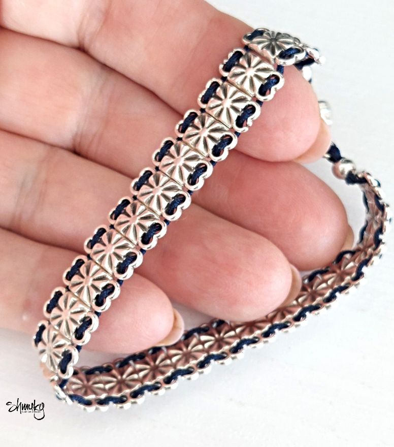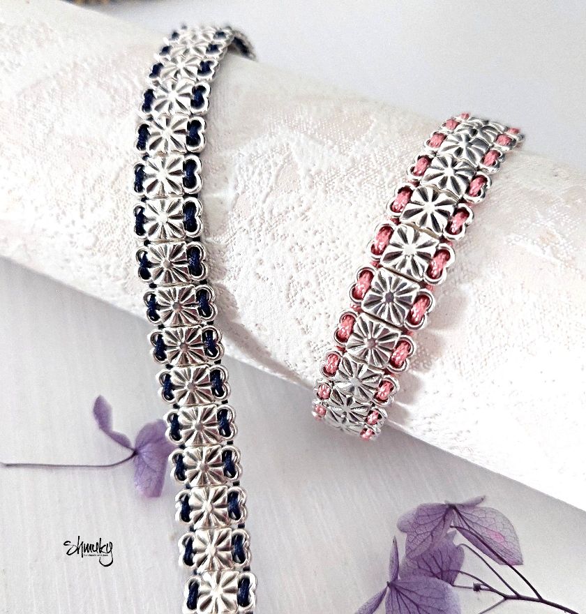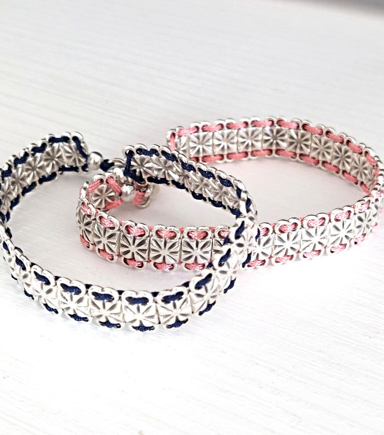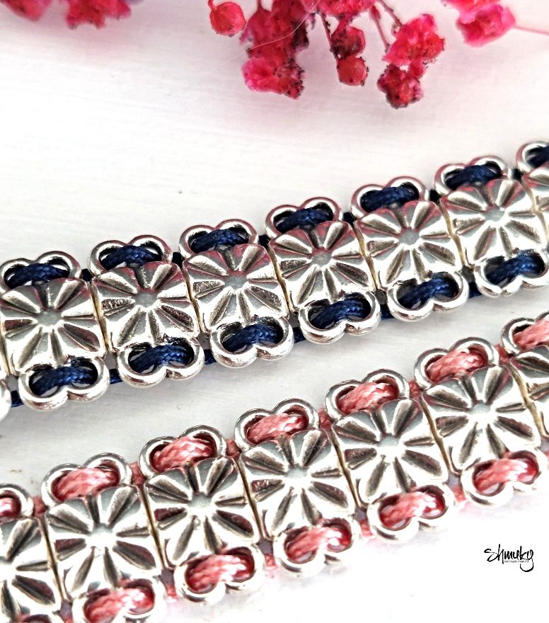 Náramky jsem vyrobila z postříbřených článků z bižuterní slitiny zamak spojením pomocí barevných nylonových šňůrek, konkrétně v růžové a tmavěmodré barvě.