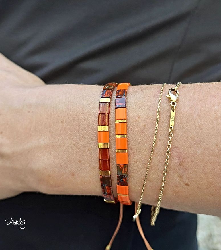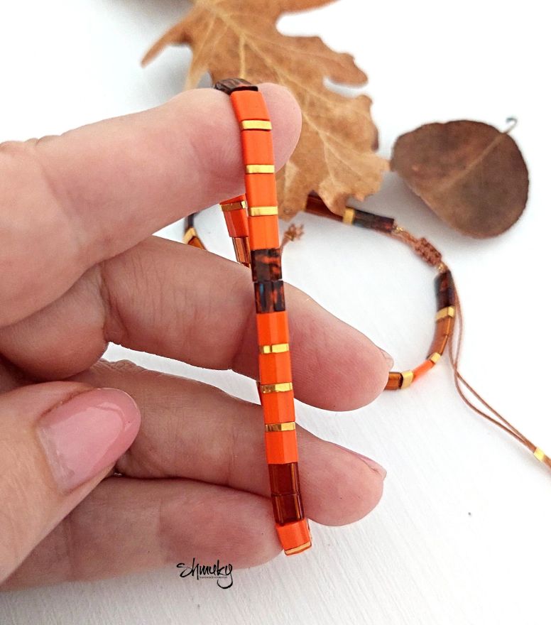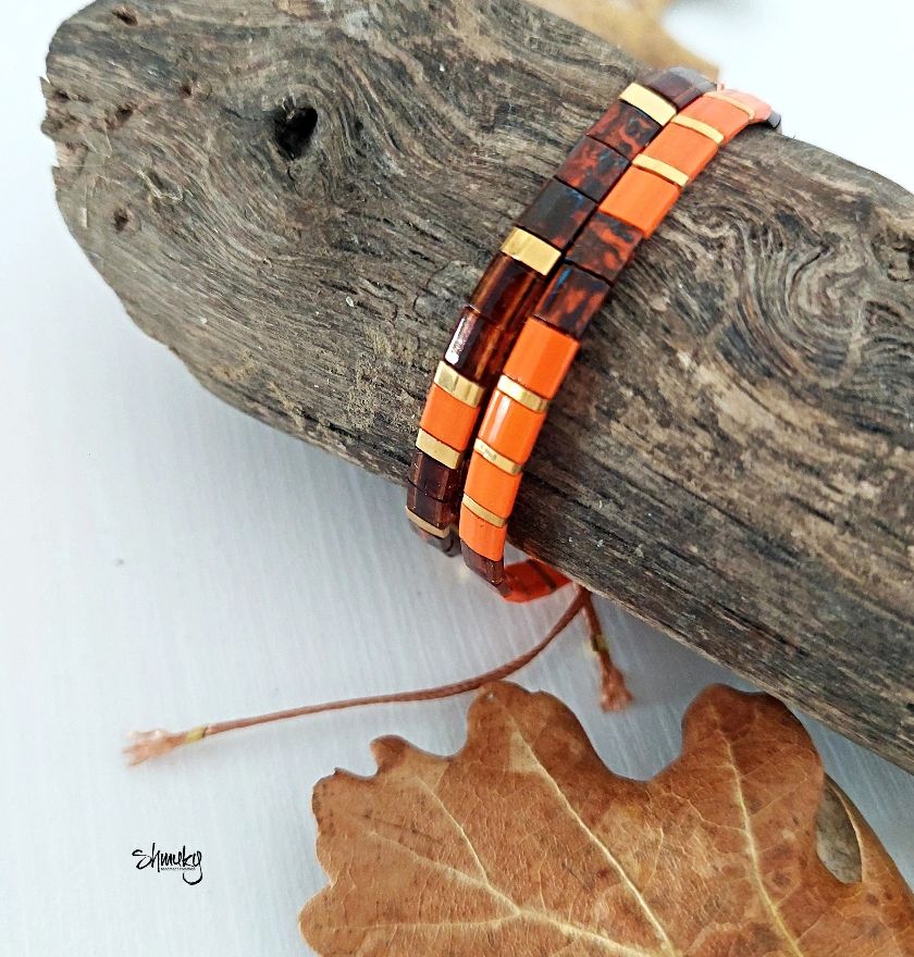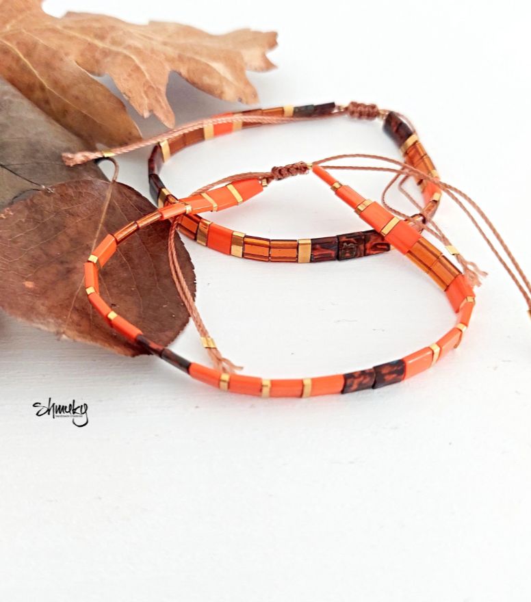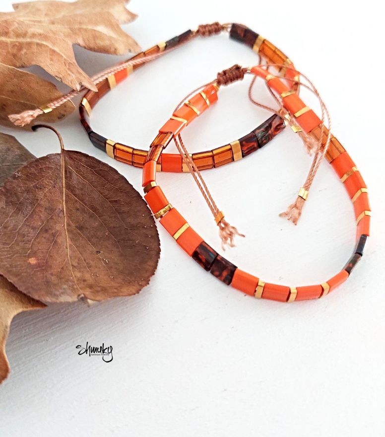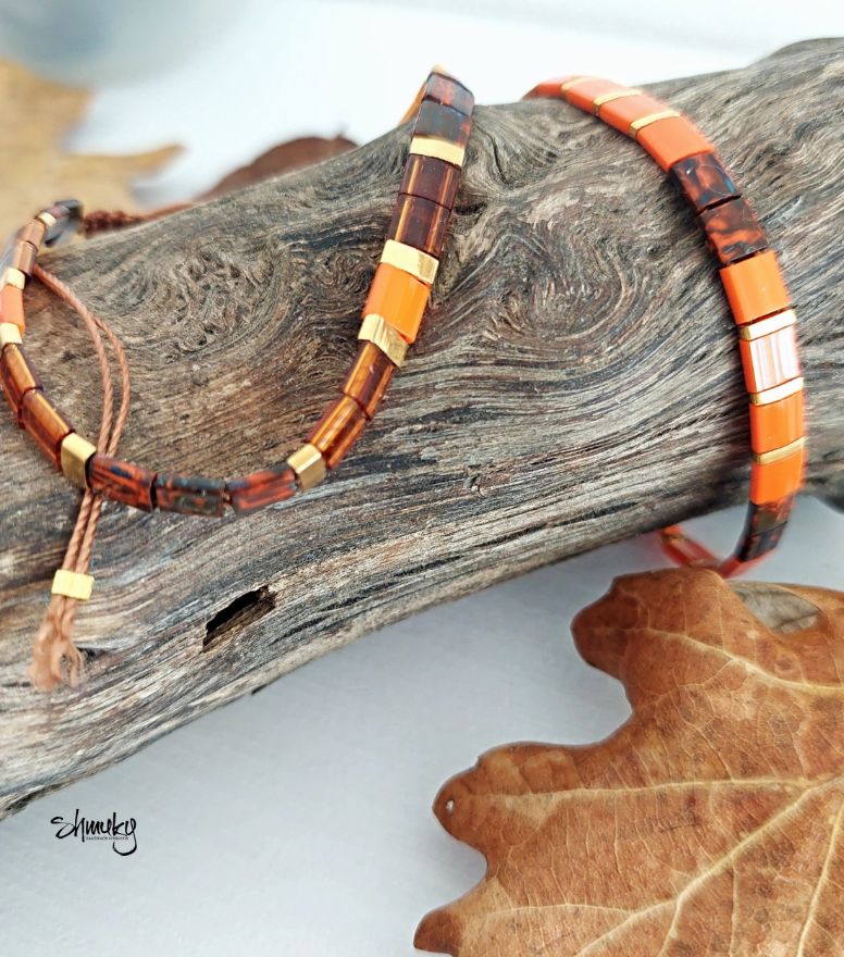 Set dvou náramků v kombinaci podzimních odstínů. Ploché japonské korálky jsou návléknuty na hnědé šňůrce, korálky ve zlatém provedení jsou zlacené 24karátovým zlatem.